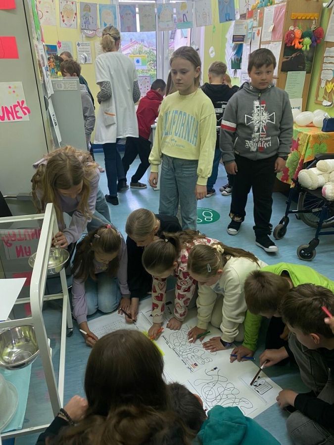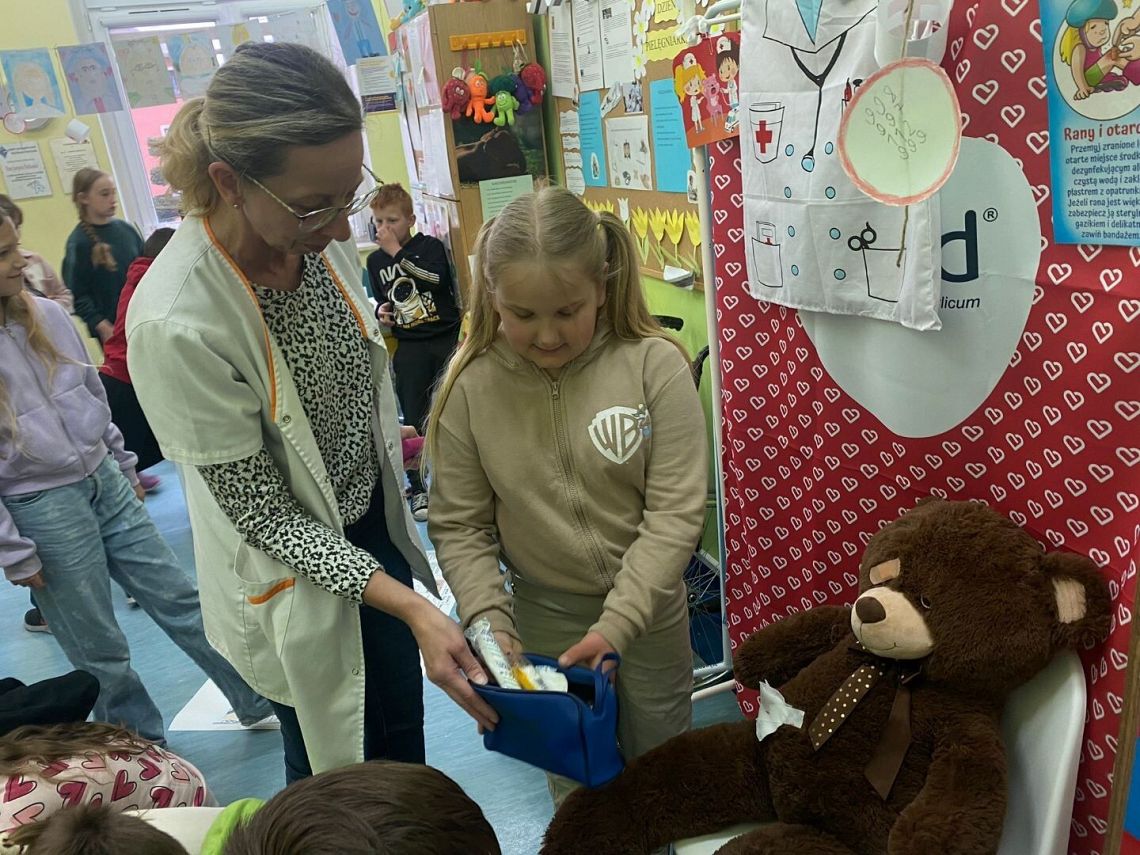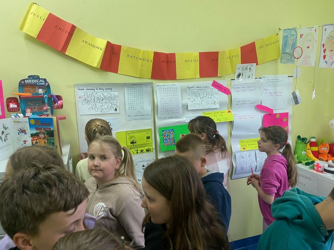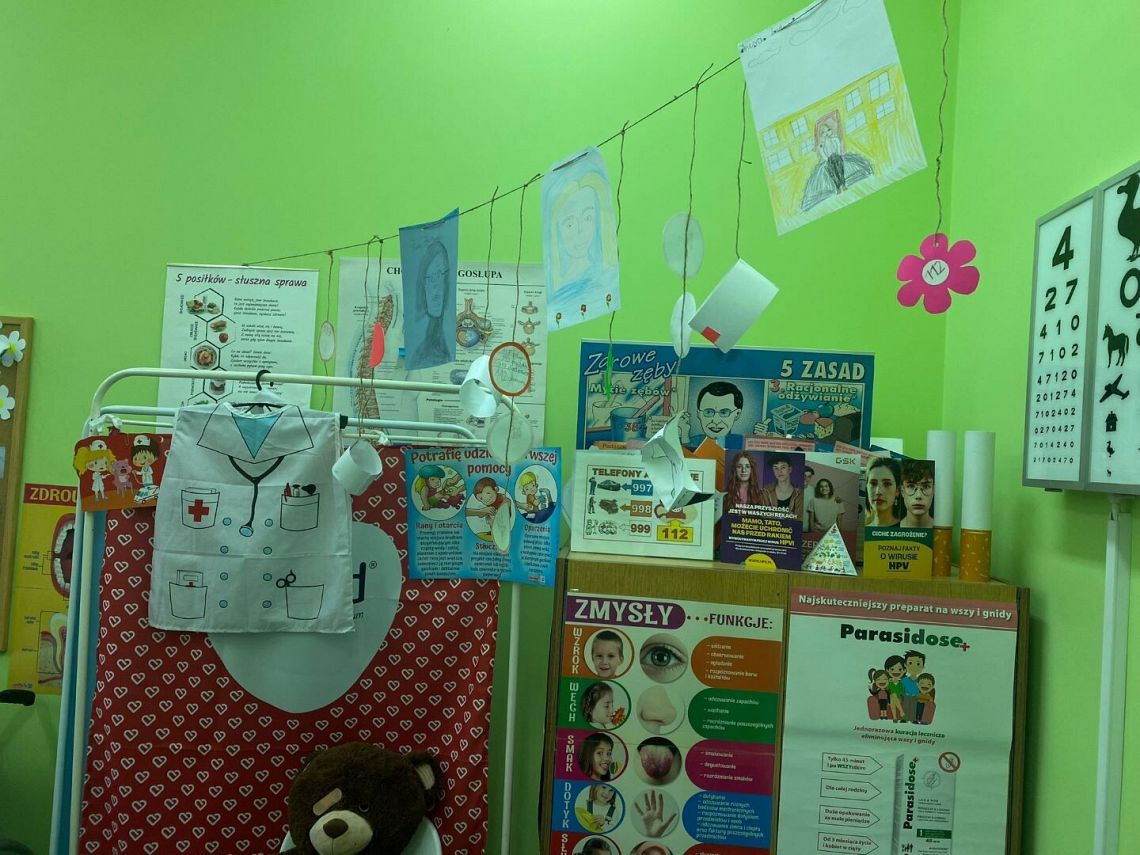 Z okazji Międzynarodowego Dnia Pielęgniarki w piątek 10 maja pani pielęgniarka Justyna zaprosiła uczniów do swojego gabinetu. Przygotowała dla nich wiele niespodzianek. Uczniowie mieli okazję sprawdzić swoją wiedzę na temat zdrowia i pomocy przedmedycznej. Były tam rebusy, zagadki, układanki, zadania matematyczne, kolorowanki i ćwiczenia praktyczne.