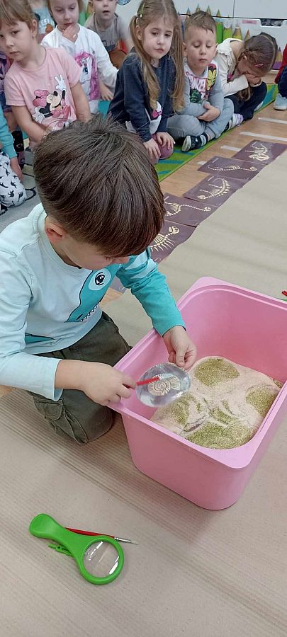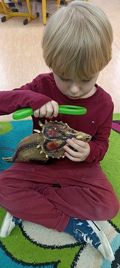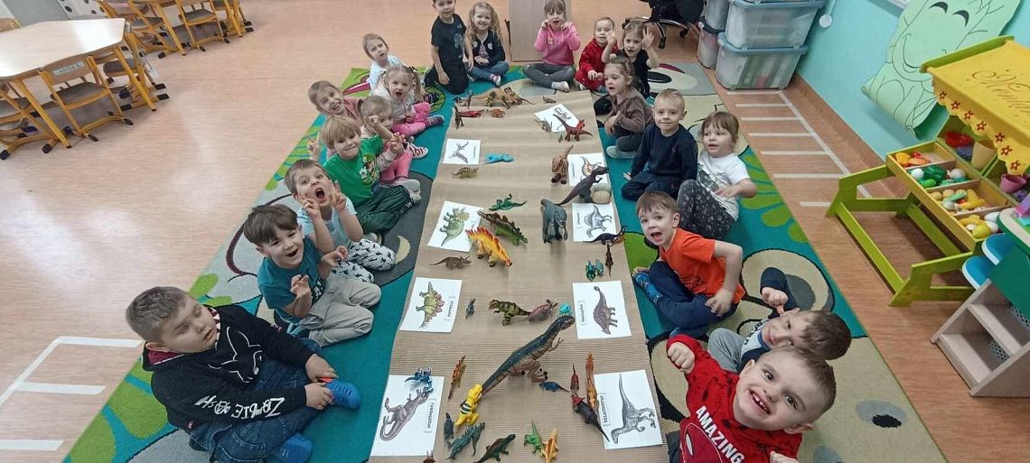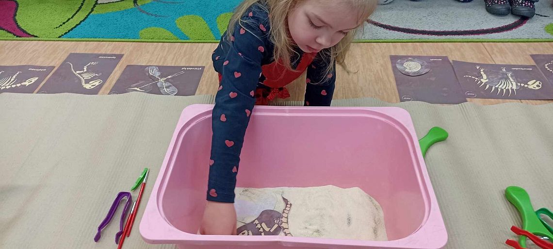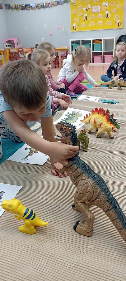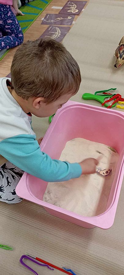 Przez cały tydzień w grupie 4-latków królowały dinozaury. Dzieci poznały historię dinozaurów, dowiedziały się kiedy żyły, czym się żywiły i jak wyglądały. Rozmawialiśmy na temat pracy paleontologa i wspólnie dokonaliśmy ,,wykopalisk" dzięki którym zobaczyliśmy jak wyglądają szkielety niektórych dinozaurów.