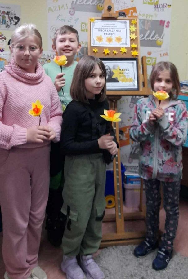 Podczas lekcji plastyki, zgodnie ze wskazówkami Pana Sławka, uczniowie tworzyli papierowe żonkile - symbol upamiętniający powstanie w getcie warszawskim. Kulminacyjnym momentem obchodów był dzień 19 kwietnia, kiedy to uczniowie z Samorządu Uczniowskiego wręczali nauczycielom i uczniom wykonane wcześniej żonkile.