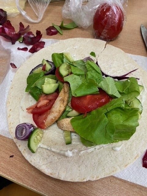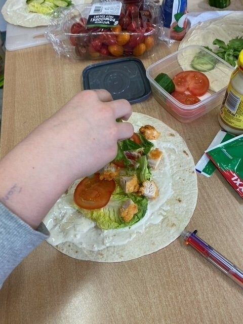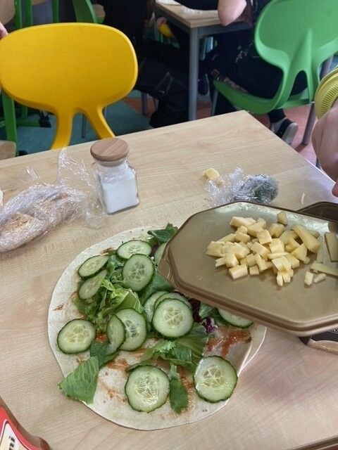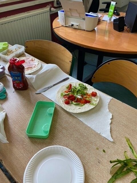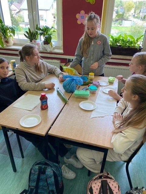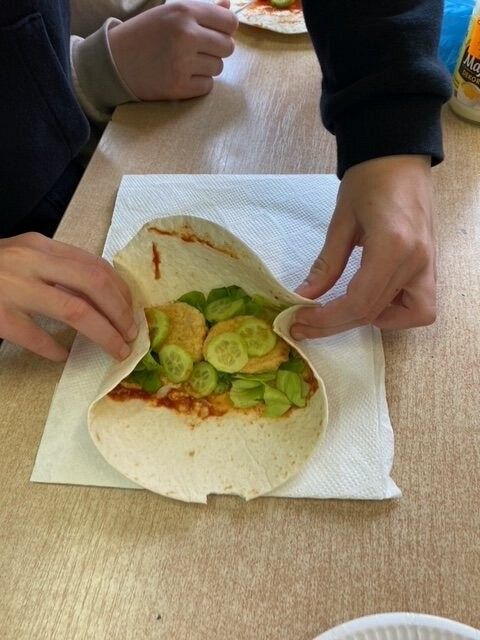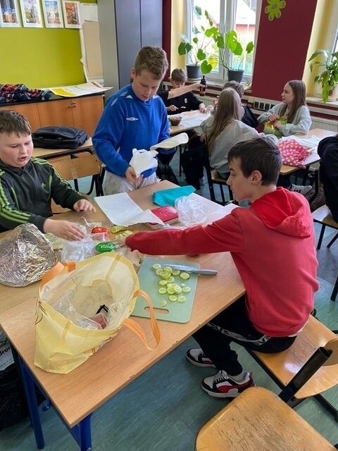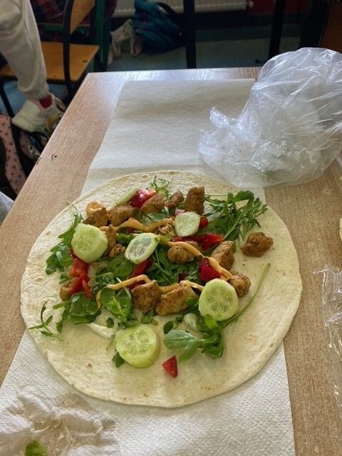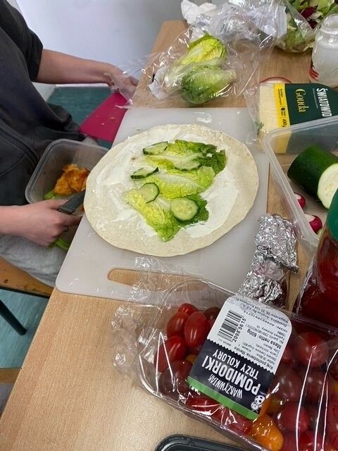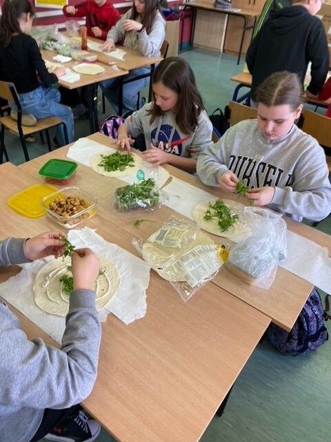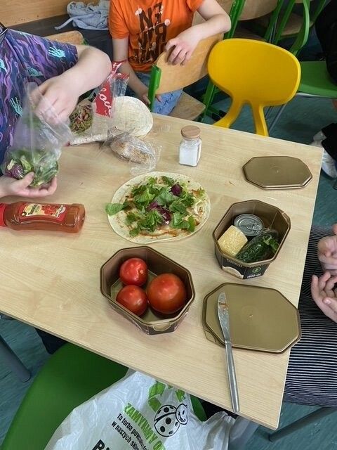 Uczniowie klas piątych w ramach zajęć z techniki robili zdrowe tortille. Na wcześniejszych zajęciach zapoznali się z zasadami zdrowego odżywiania, a w szczególności jak komponować posiłki, by były pełnowartościowe. Zgodnie z piramidą zdrowego żywienia w każdym posiłku najwięcej powinno być warzyw. Okazało się, że nawet popularny tzw. “fast food” może spełniać kryteria wartościowego posiłku.
