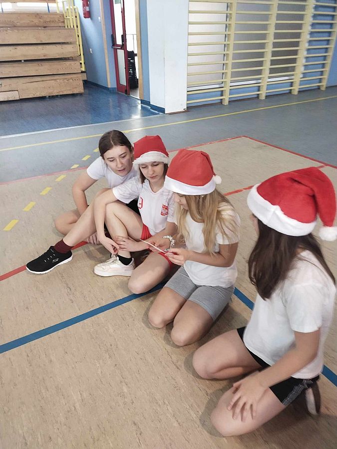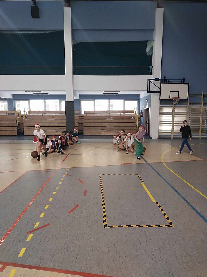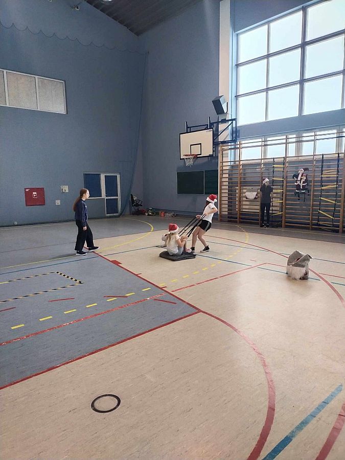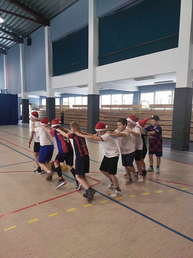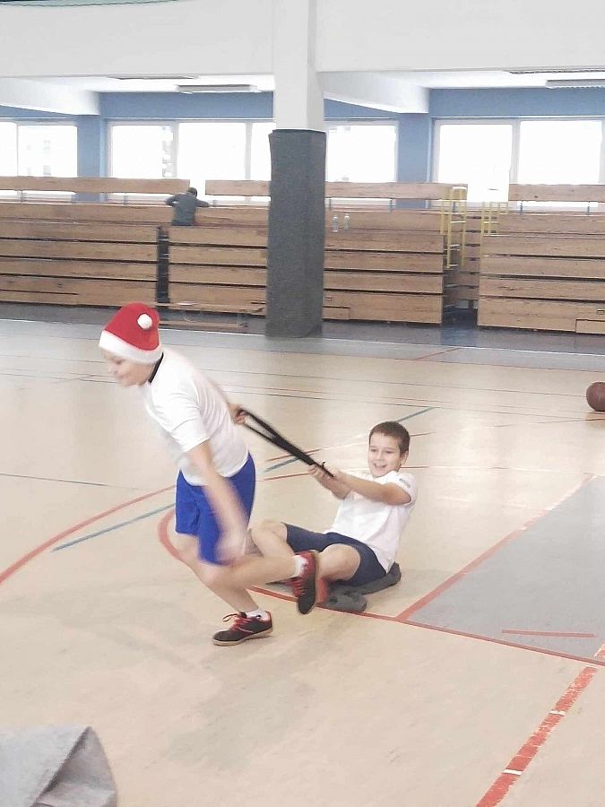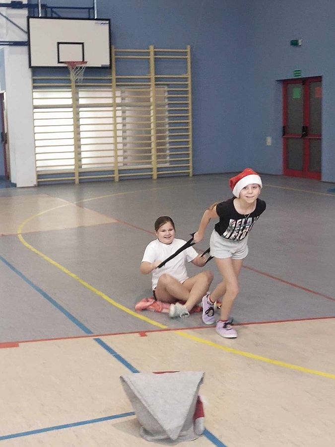 Szóstego grudnia w naszej szkole oprócz wizyty świętego Mikołaja, dzieci miały okazję uczestniczyć w grach, zabawach i rozgrywkach sportowych o tematyce mikołajkowej. Zamiast tradycyjnej lekcji w-fu uczniowie wykonywali polecenia św. Mikołaja: jeździły na "mikołajkowych” saniach, toczyły śnieżne kule i wskakiwały do komina. Wszystko w rytm kolęd i piosenek świątecznych. Na koniec Mikołaj nagrodził uczestników świątecznym ciasteczkiem. Brawo za zaangażowanie, sportową rywalizację oraz ćwiczenie poprzez zabawę.