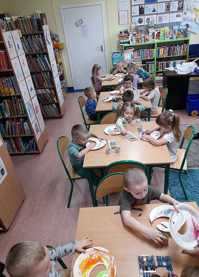 Dinozaury nie nudzą się także przedszkolakom, które odwiedziły w dniu dzisiejszym bibliotekę. Maluchy "zaprzyjaźniły się" z Ivarem i tyranozaurem!!!!, bohaterami książki zamieszkującej Krainę Dinozaurów (pudełko:), której fragmenty przytoczono wyżej! Na koniec spotkania dzieci wykonały (według wskazówek Pani Kornelii:) ) z papierowych talerzyków DINOZAURY!