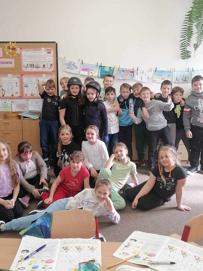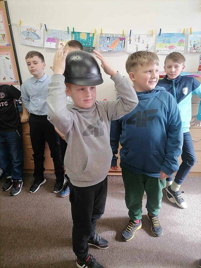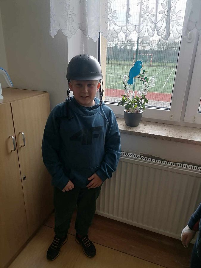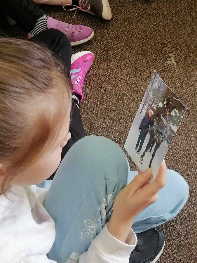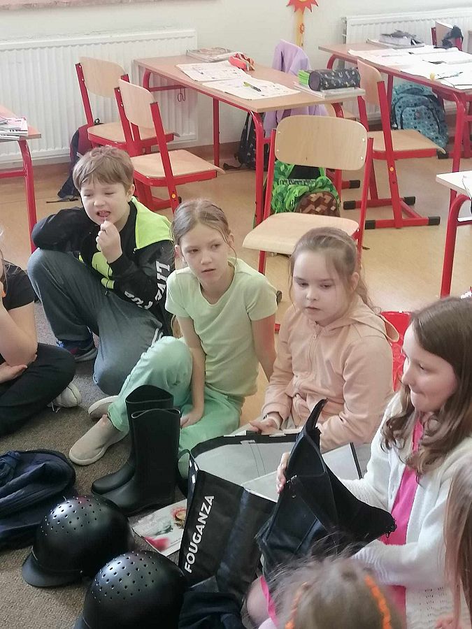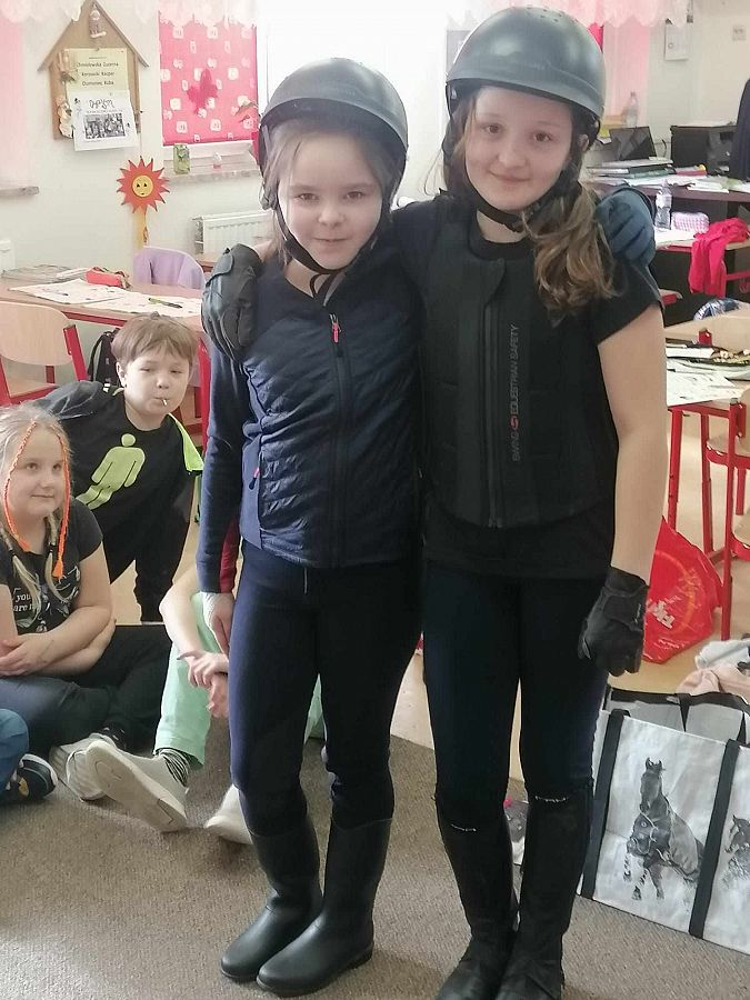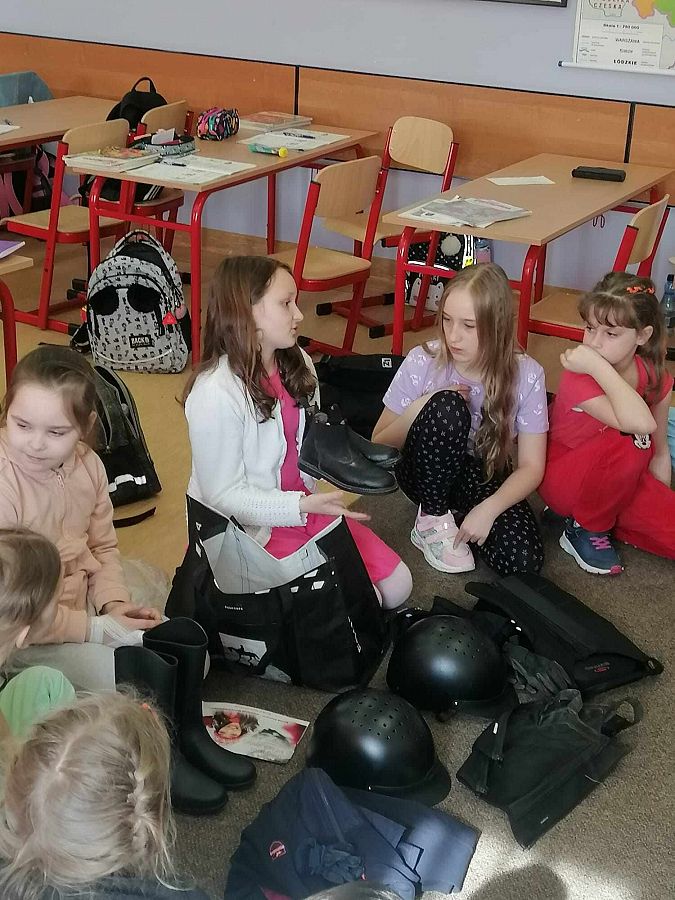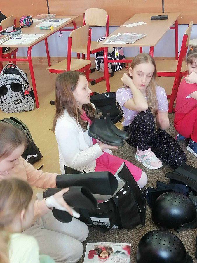 Podczas kolejnego spotkania, tym razem z koleżankami z klasy, Leną i Izą, którzy pasjonują się końmi i nauką jazdy na koniu, uczniowie mieli okazję poznać stajnię oraz sprzęt do jazdy konnej. Mogli przymierzyć różne elementy wyposażenia i przeglądać książki poświęcone tematyce koni. To było fascynujące doświadczenie, które pozwoliło im lepiej zrozumieć świat koni i pasję swoich koleżanek.
