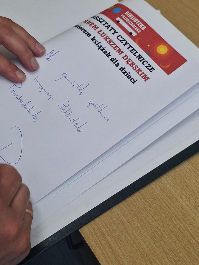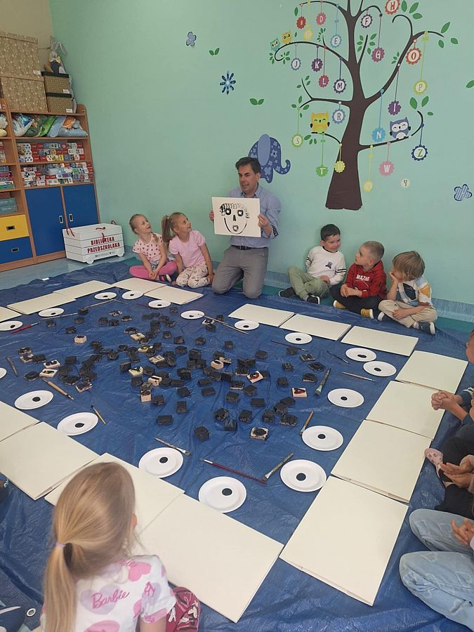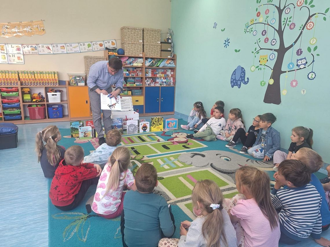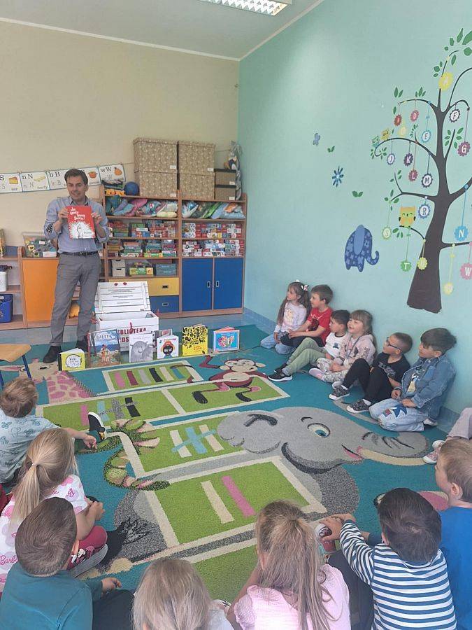 Dziś na zaproszenie biblioteki szkolnej gościliśmy w przedszkolu wyjątkowego gościa – pisarza, Łukasza Dębskiego, prezesa Fundacji Burza Mózgów z Krakowa i twórcę projektu „Biblioteczka Przedszkolaka”. W spotkaniu udział wzięła grupa 0C, dla której przygotowano świetne warsztaty: dzieci poznały zawartość kuferka z książkami i pomocami, stworzyły autoportrety z literowych pieczątek, ilustrowały przeczytaną książkę i wypełniały karty pracy. To już drugie spotkanie z Panem Łukaszem – pierwszy raz odwiedził nas w 2020 roku. Projekt potrwa do końca roku i promuje czytelnictwo wśród najmłodszych