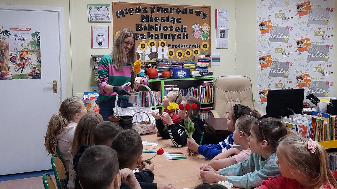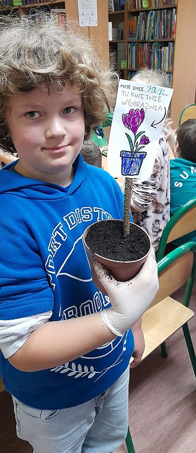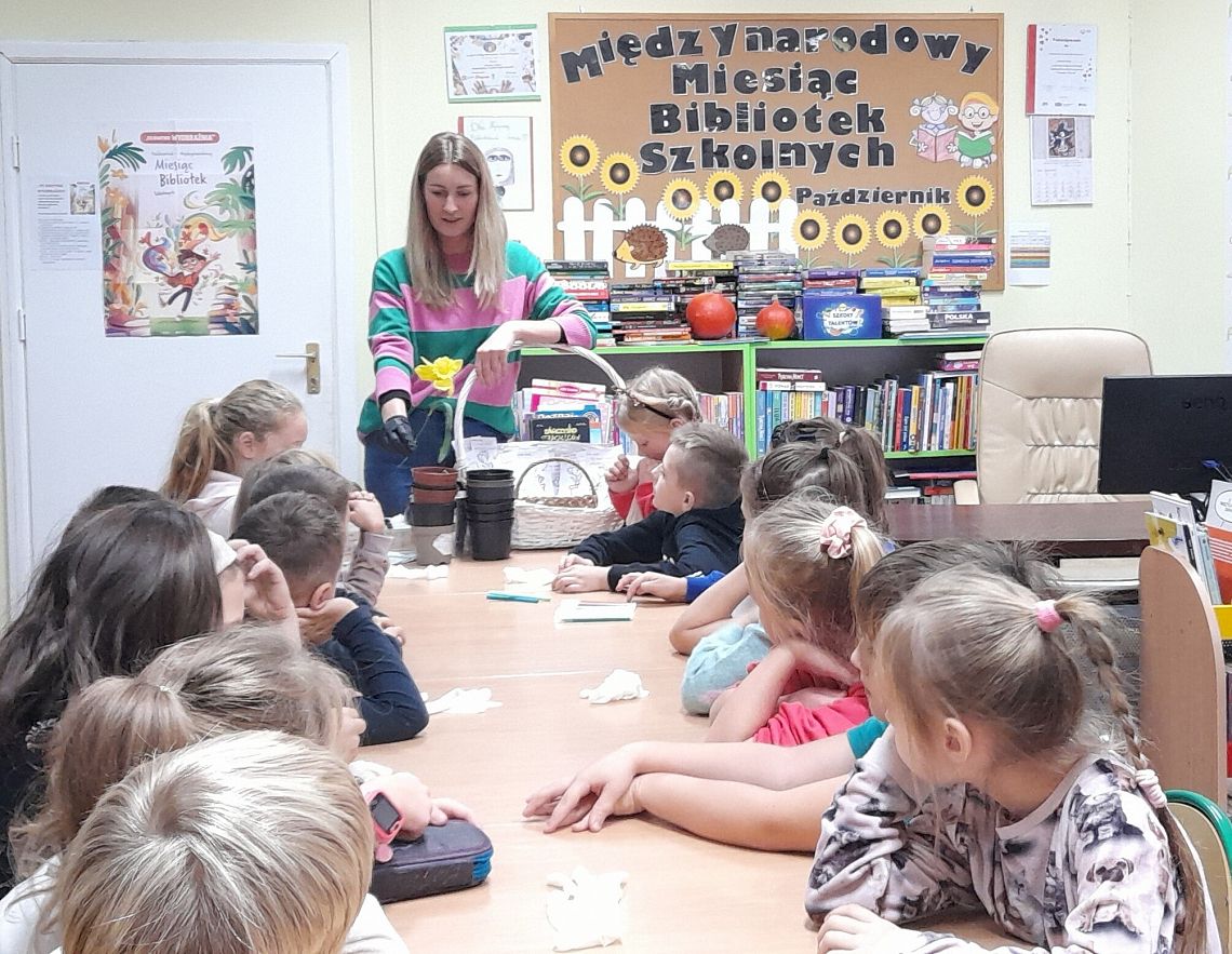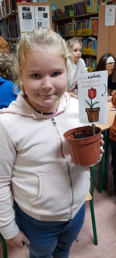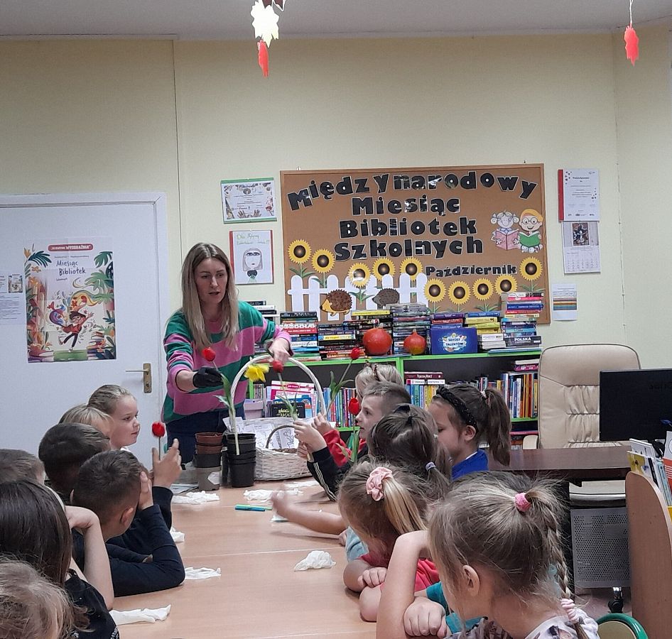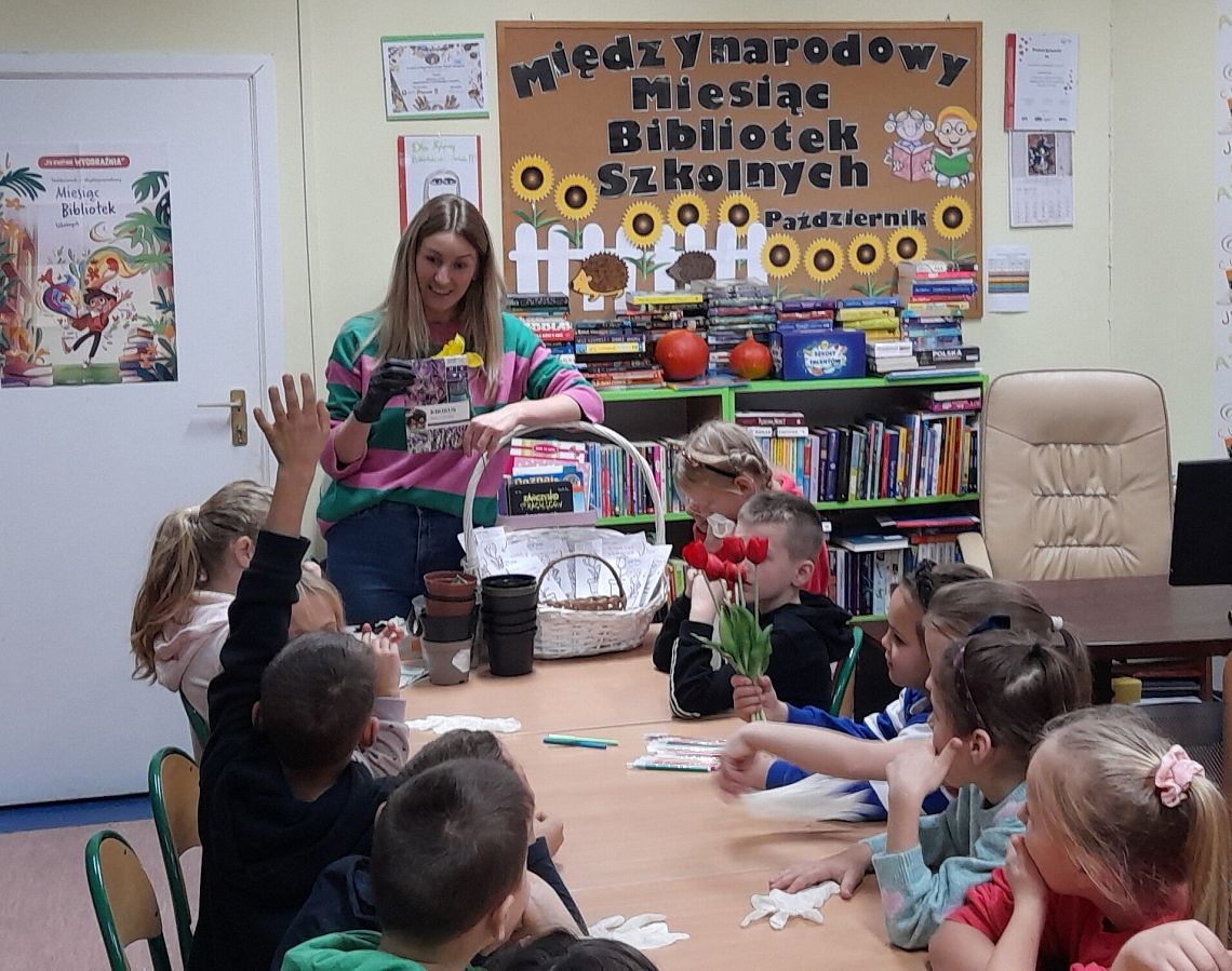 „Biblioteka - tu kwitnie wyobraźnia!” W dniu dzisiejszym hasło tegorocznych obchodów Miesiąca Bibliotek Szkolnych, zainspirowało uczniów z klasy 2 a do zabawy w ogrodników. Pod fachowym okiem Pani Estery Jędrzejewskiej, która prowadzi „Kwiaciarnię Polna” w Bożympolu oraz sprawuje funkcję radnej w naszej gminie, uczniowie posadzili w doniczkach cebulki wiosennych kwiatów. Pani Estera zaprosiła również dzieci do pogawędki na temat pięknego i pachnącego świata kwiatów. Sprawiła, że poczuliśmy się jak w kwiaciarni i wyobraziliśmy sobie, ile cierpliwości i wyobraźni wymaga praca kwiaciarki. Bardzo serdecznie dziękujemy pani Esterze za poświęcony czas i upominki (także te słodkie: ) i obiecujemy opiekować się posadzonymi roślinkami, żeby na wiosnę cieszyć się ich pięknem.
