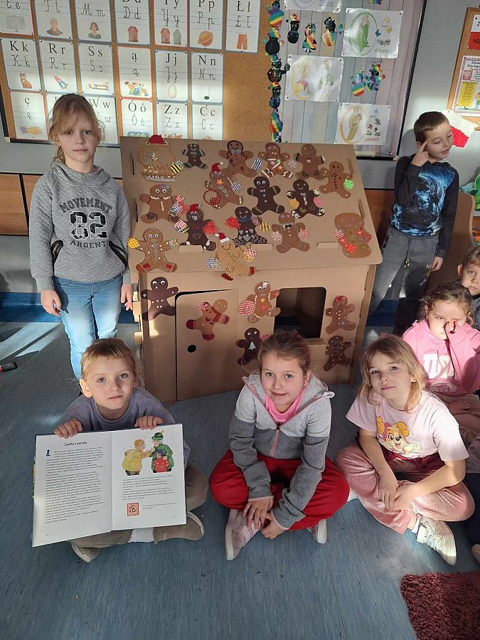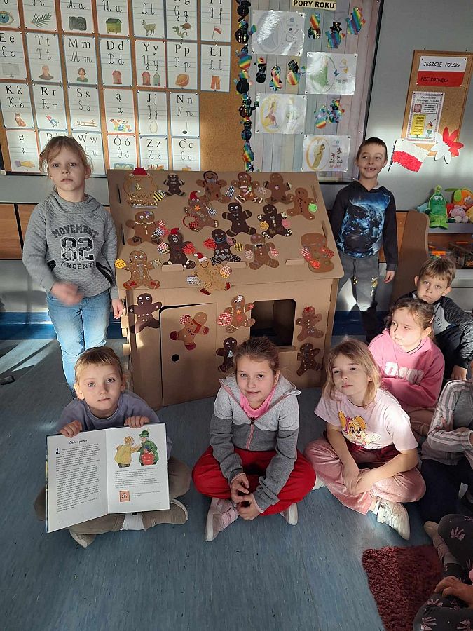 Dzieci z klasy 1b codziennie z radością kontynuują adwentowe czytanie w ramach ogólnopolskiej akcji "Adwentowe czytanie na Święta". Po przeczytaniu opowiadania "Chatka z piernika", znalazły również czas na twórczą zabawę – przyozdabianie pięknej, dużej piernikowej chatki.