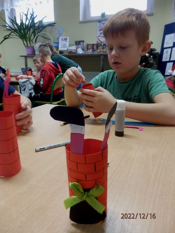 „Na czerwonej kartce czarnym flamastrem rysujemy cegły. Komin gotowy! Czas na Mikołaja, który z poświęceniem wciska się do komina, aby podarować dzieciom prezenty. W tym celu wycinamy elementy postaci Mikołaja: