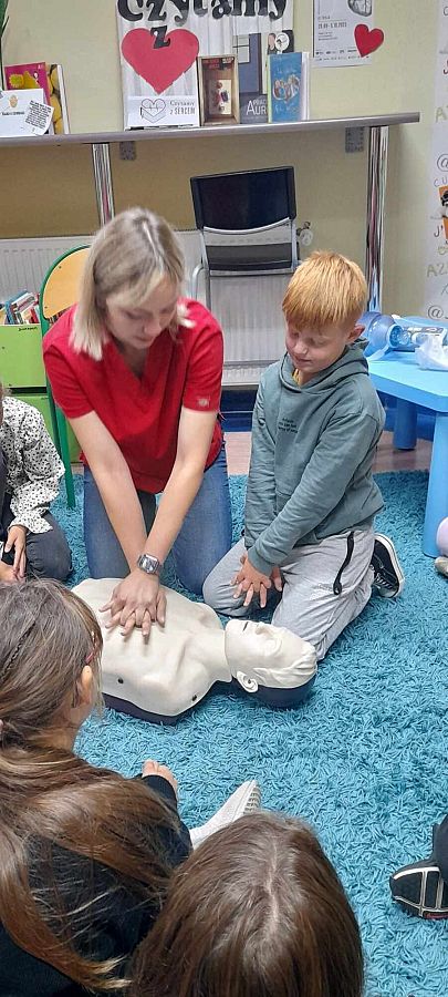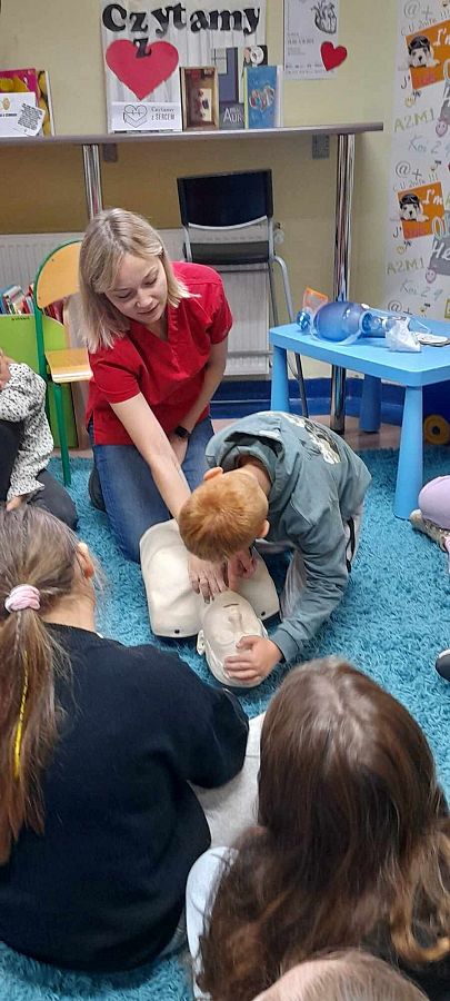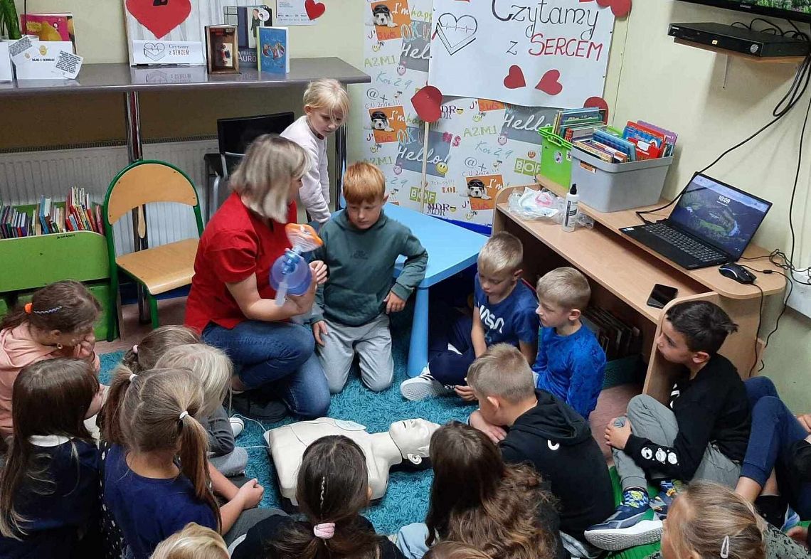 Na początek Pani Dominika zaproponowała dzieciom obejrzenie serialu „Było sobie życie. Serce”. Odcinek zabrał ich na wyprawę w głąb ludzkiego organizmu i opowiedział o funkcjonowaniu w nim serca. Po filmie pielęgniarka przypomniała uczniom, jak należy zachować się w sytuacji stanowiącej zagrożenie dla zdrowia i życia ludzi. Zademonstrowała na fantomie, we współpracy z uczniami, jak należy prawidłowo wykonywać resuscytację. Ważną częścią spotkania był pokaz z użyciem defibrylatora AED, który na uczniach zrobił duże wrażenie.