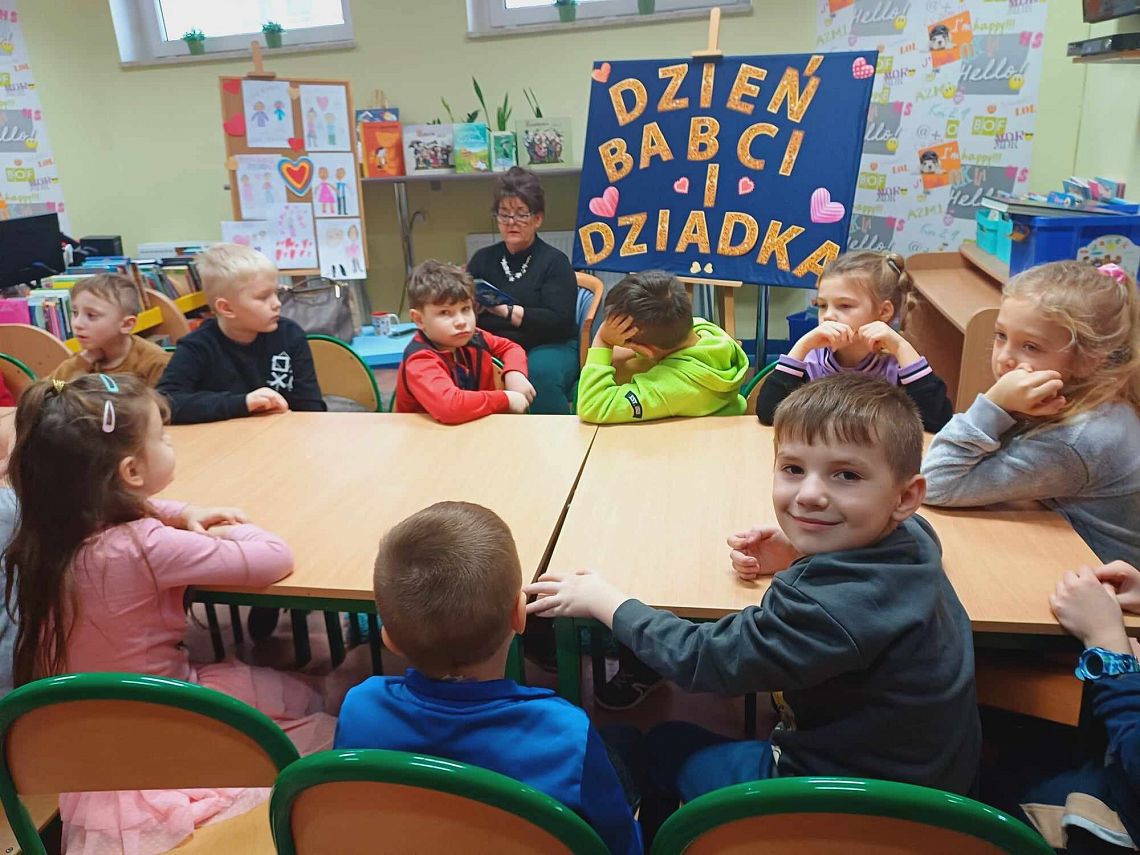 Dzień Babci w Bibliotece. Spotkanie z Wyjątkową Czytelniczką, Panią Janiną oraz klasą 1b