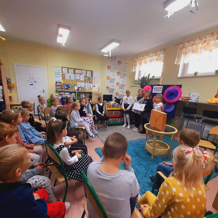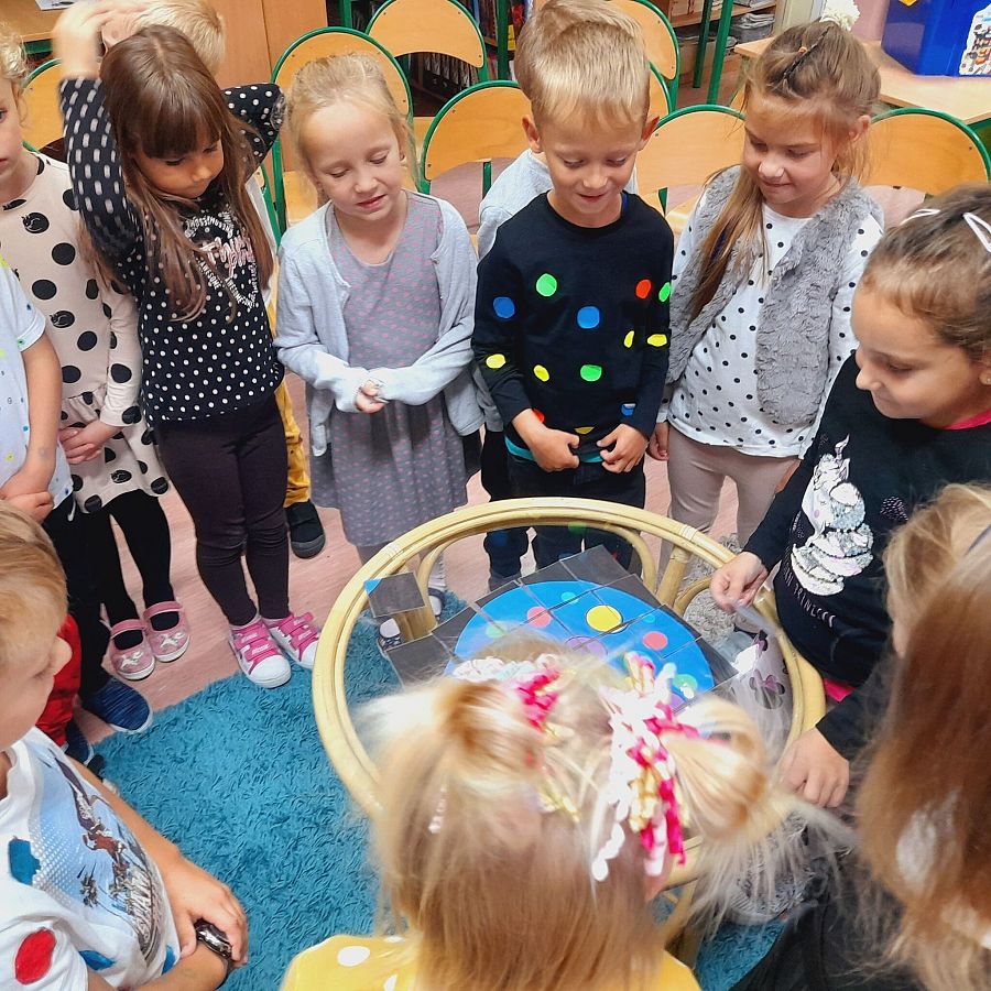 Do wspólnej zabawy zaprosiliśmy przedszkolaki z grupy 0A, przed którymi, nawiązując do wspomnianego święta, wystąpiły dziewczynki z Małego Kółka Bibliotecznego. Dzieci, oglądając teatrzyk kamishibai, poznały również historię małej Vashti, nieśmiałej dziewczynki, która dzięki nauczycielce od plastyki, uwierzyła w siebie i poznała swój talent. Na zakończenie spotkania, bawiły się w kodowanie oraz układanie puzzli. Zgadniecie jakich? Oczywiście, że w kropki! To był naprawdę dzień wyjątkowy, bo w kropki malowany!