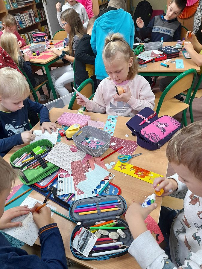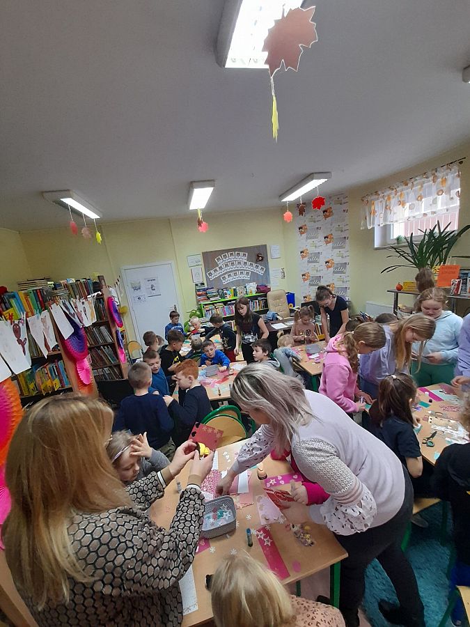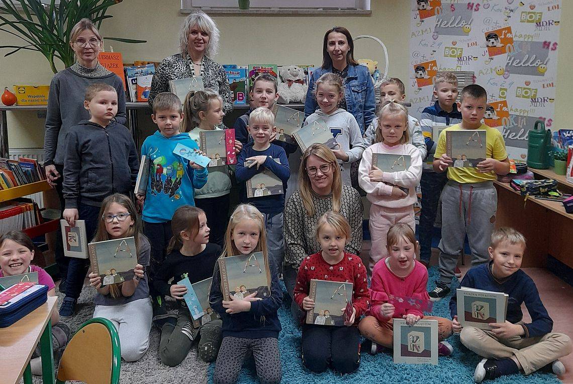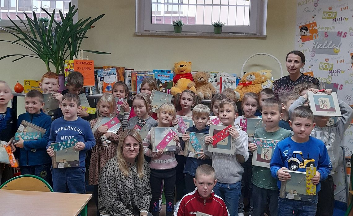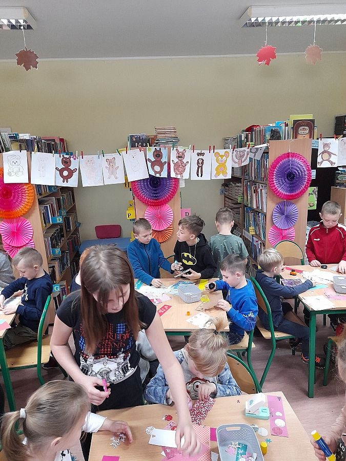 Wspaniałe humory i znakomite pomysły towarzyszyły uczniom podczas tworzenia zakładek do książek oraz gry w misiowe domino. Dzieci chętnie uczestniczyły w urodzinowej zabawie, a na jej zakończenie otrzymały od Pań Bibliotekarek książki „Pierwsze abecadło” otrzymane od Instytutu Książki.