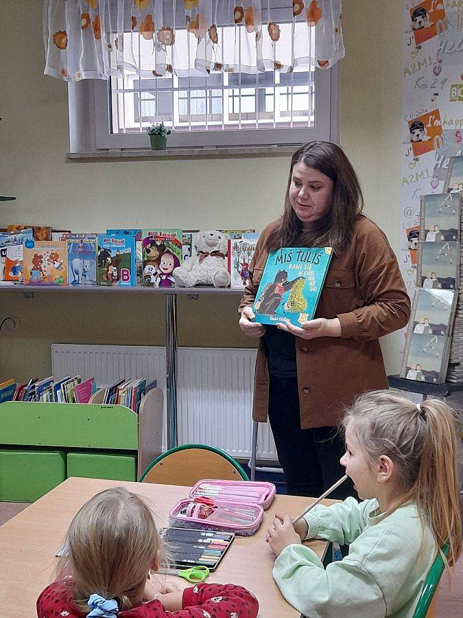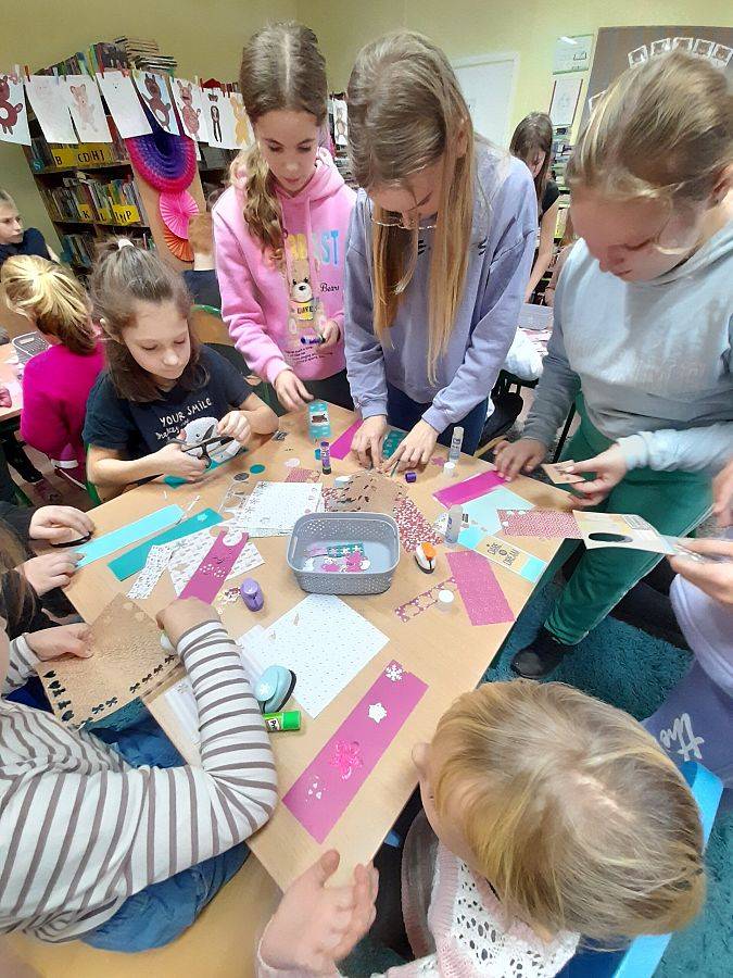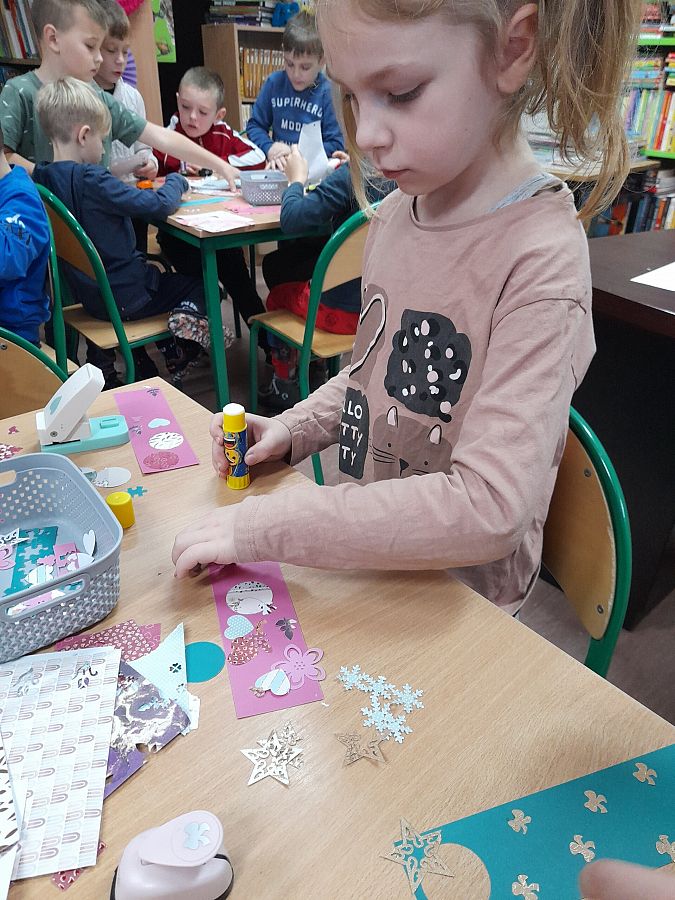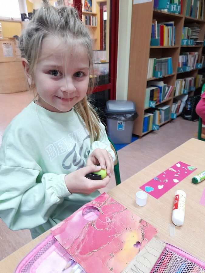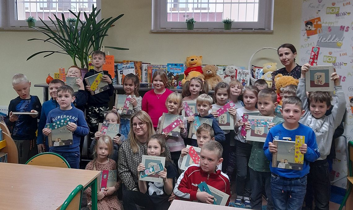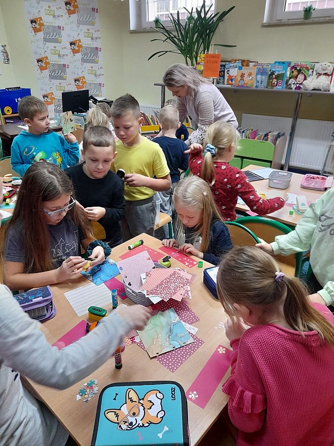 Wspaniałe humory i znakomite pomysły towarzyszyły uczniom podczas tworzenia zakładek do książek oraz gry w misiowe domino. Dzieci chętnie uczestniczyły w urodzinowej zabawie, a na jej zakończenie otrzymały od Pań Bibliotekarek książki „Pierwsze abecadło” otrzymane od Instytutu Książki.