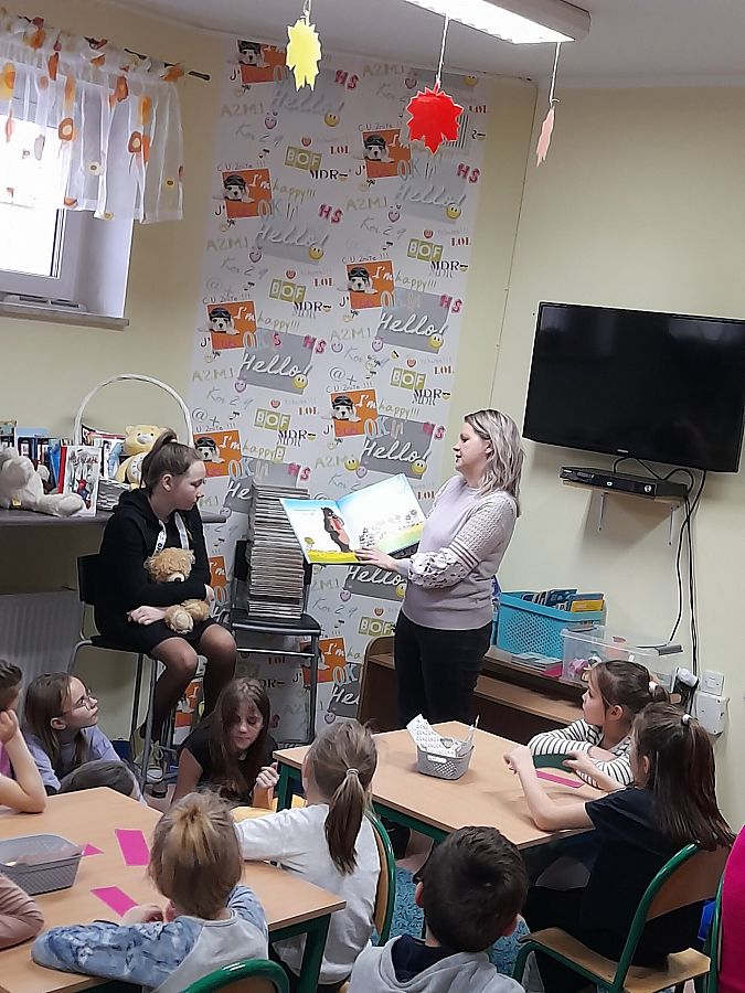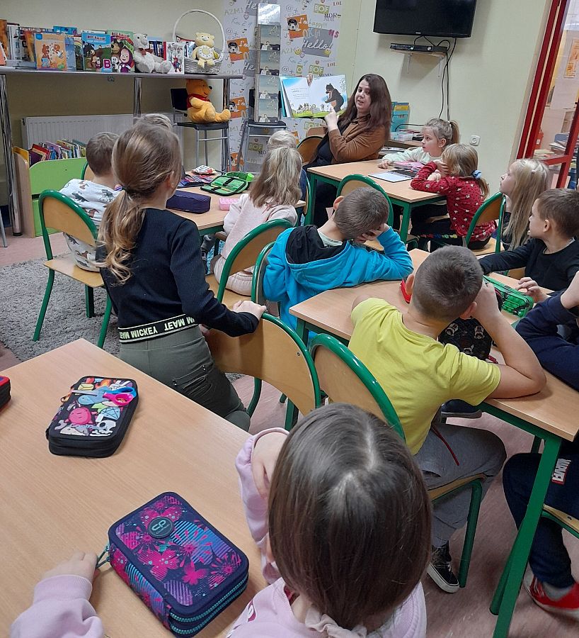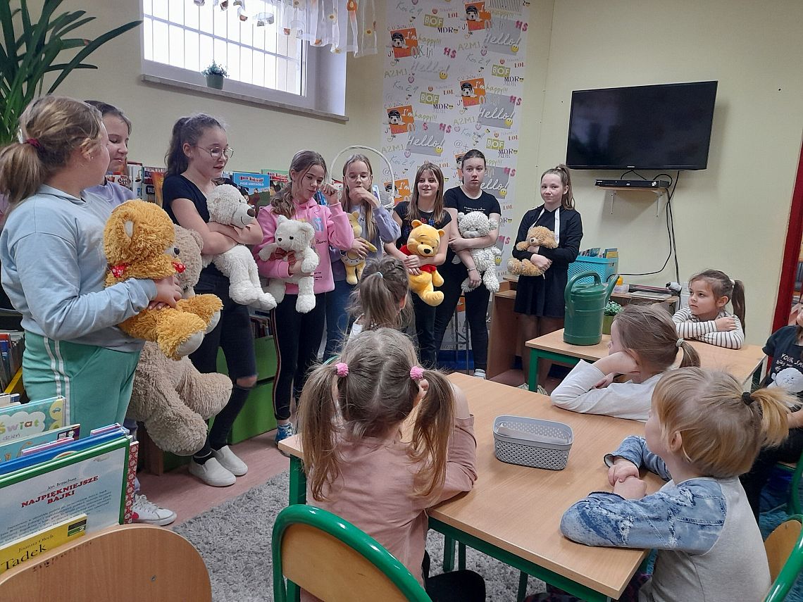 W dniu dzisiejszym zaprosiliśmy do biblioteki uczniów z klas pierwszych, aby uczcić zbliżające się urodziny Pluszowego Misia oraz przyjąć dzieci w szeregi czytelników naszych bibliotek. Uczniowie obejrzeli scenkę pt. „Wszystkie misie nasze są” przygotowane przez dziewczynki z klasy 5 b, oraz wysłuchały opowiadania o „Misiu Tulisiu” przeczytanego przez Panią Agnieszkę z Biblioteki Publicznej i Panią Katarzynę, przewodniczącą Rady Rodziców.