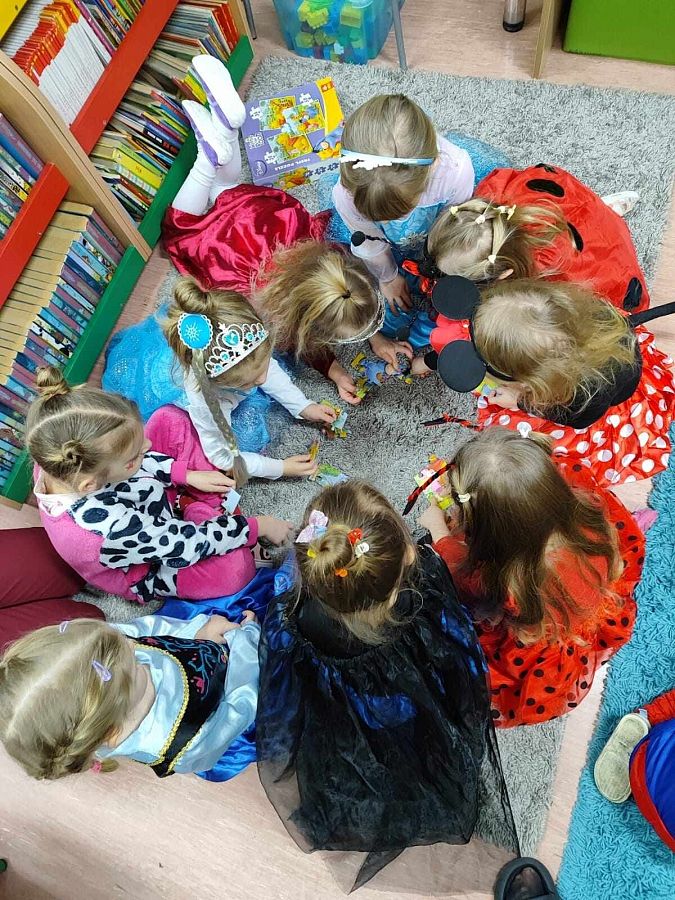Dziś w bibliotece grupa przedszkolaków z 0E wzięła udział w kolejnym spotkaniu projektu "Sensoryczny Kogel-Mogel". Bajkowo ubrane maluchy świętowały Dzień Puzzli, poszukując brakujących elementów w książkach, a następnie układając kolorowe puzzle i logiczne układanki. Spotkanie to nie tylko rozwijało umiejętności logicznego myślenia, ale także przyniosło radość, kreatywność i wspólne zabawy w krainie literatury.