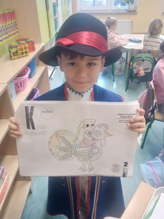 Dziś przedszkolaki z grupy 0A poznały kolejną książkę z „Biblioteki Przedszkolaka” - „Gdzie ty jesteś, koguciku?”. To barwna, pełna rytmu i ludowych motywów wyprawa po polskiej kulturze, w której dzieci tropią kogucika ukrytego wśród kolorowych wzorów i tradycji.