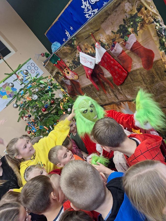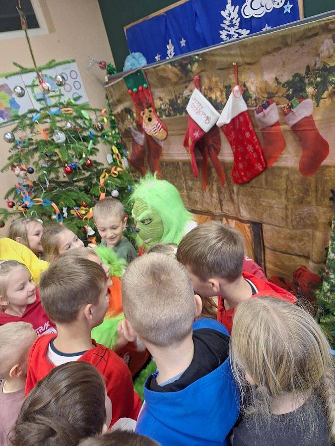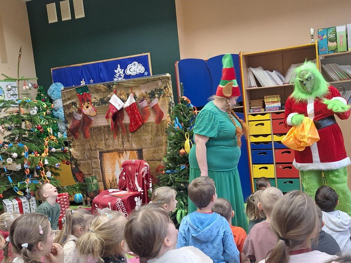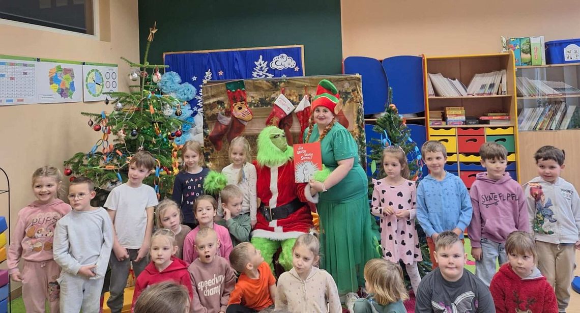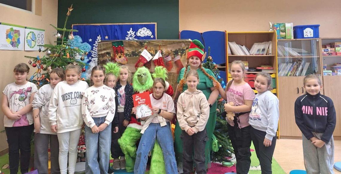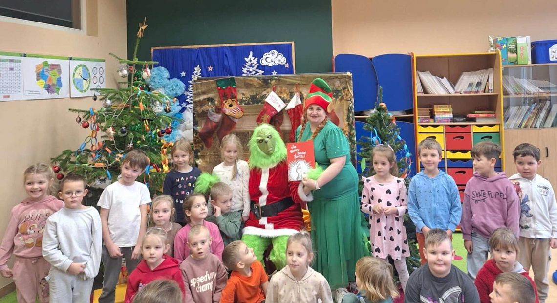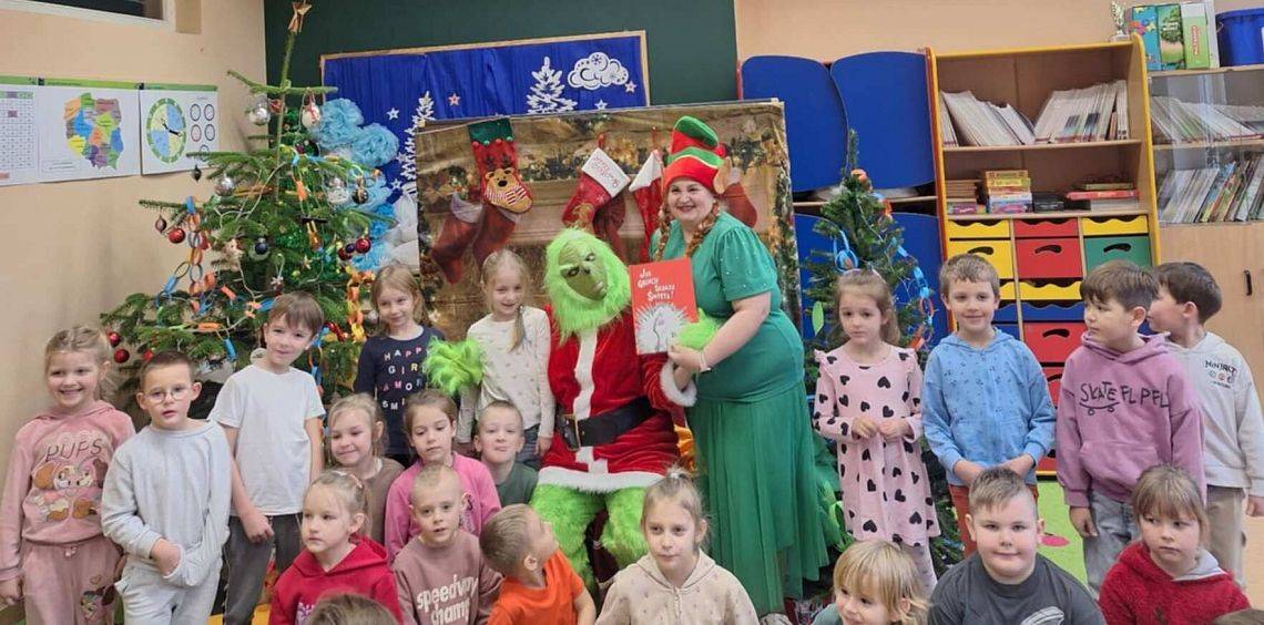 Na wspólne czytanie zaprosiliśmy uczniów z 2B, 3C oraz oczywiście głównych bohaterów dnia -grupę 0A. Okazja była wyjątkowa, bo omawialiśmy książkę „Jak Grinch skradł Święta”, którą w czarujący sposób przeczytała dzieciom Pani Monika – nasz uśmiechnięty Elfik. W pewnym momencie do sali wtargnął GRINCH! Nie książkowy, nie papierowy… tylko prawdziwy, zielony i bardzo psotny łobuz.