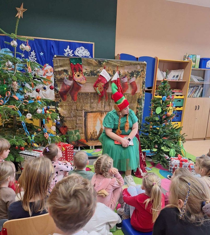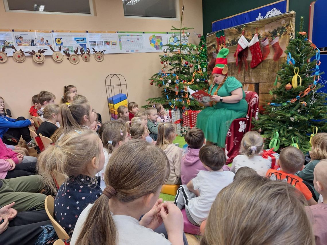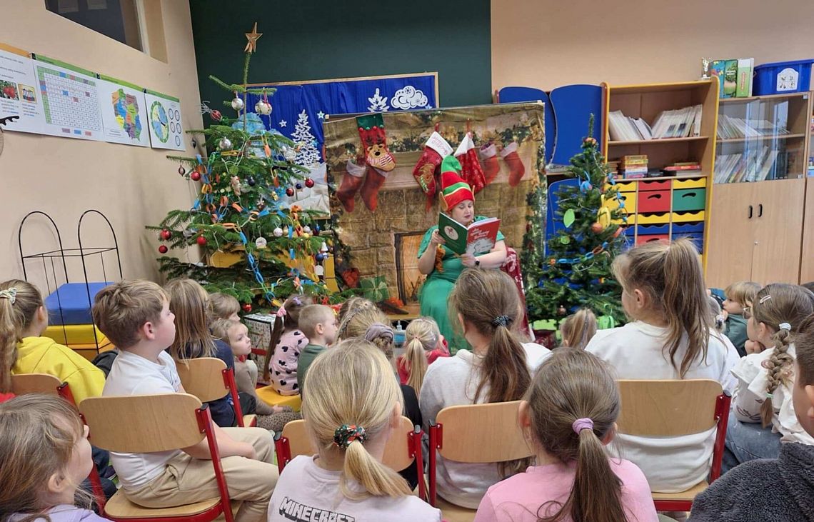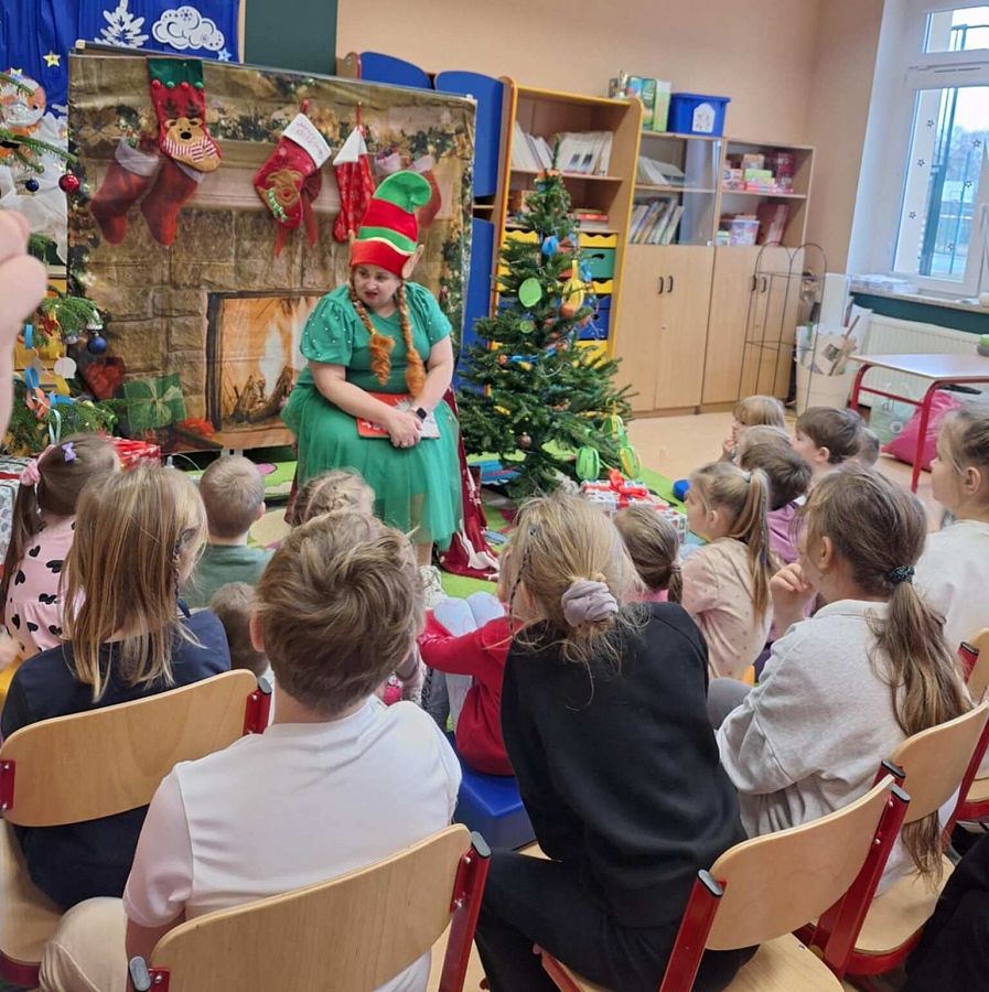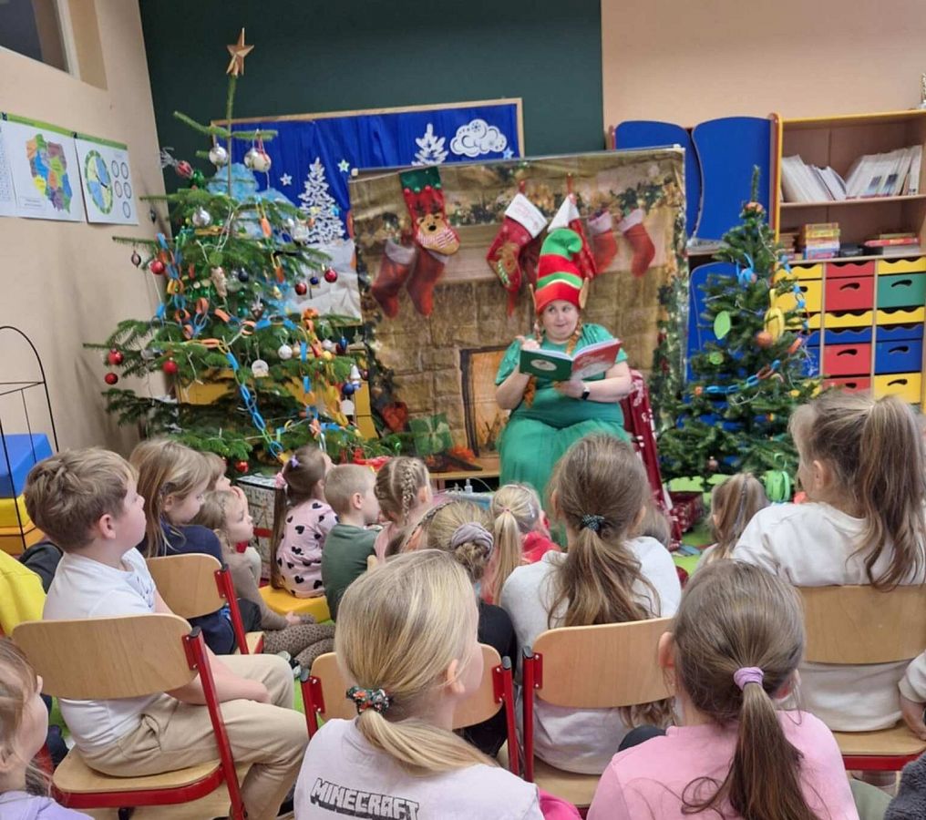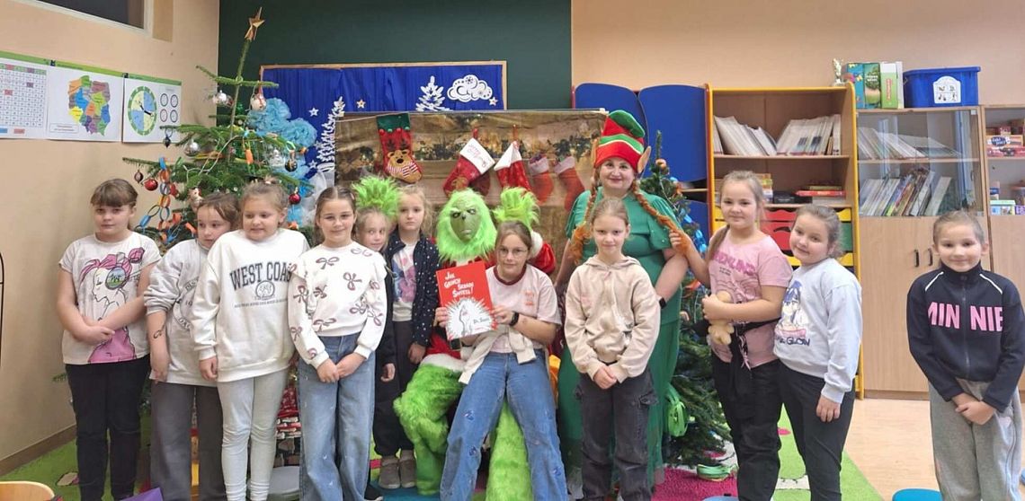 Na wspólne czytanie zaprosiliśmy uczniów z 2B, 3C oraz oczywiście głównych bohaterów dnia -grupę 0A. Okazja była wyjątkowa, bo omawialiśmy książkę „Jak Grinch skradł Święta”, którą w czarujący sposób przeczytała dzieciom Pani Monika – nasz uśmiechnięty Elfik. W pewnym momencie do sali wtargnął GRINCH! Nie książkowy, nie papierowy… tylko prawdziwy, zielony i bardzo psotny łobuz.