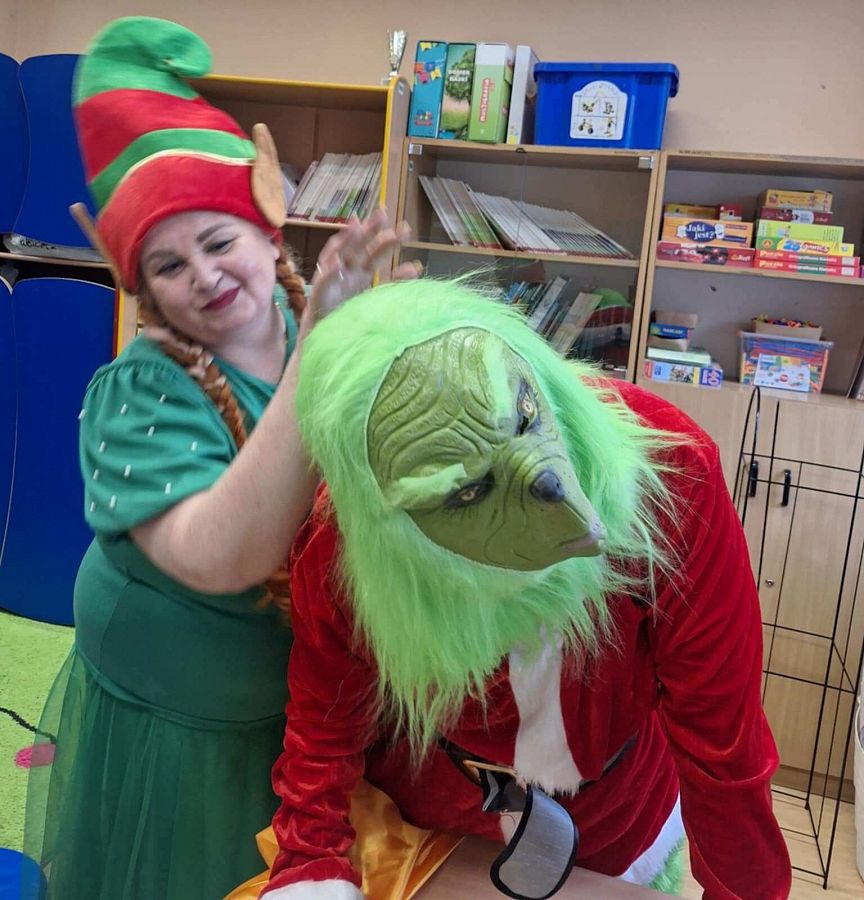 Podkradał prezenty spod choinki, przeszkadzał Pani Elf, próbował rozśmieszyć (i rozproszyć!) dzieci. No istny świąteczny chaos! Na szczęście grupa ratunkowa była na miejscu. Gdy w sali rozbrzmiały świąteczne piosenki, serce zielonego psotnika zrobiło się miękkie jak pierniczek. Grinch skruszał, przestał psocić i nawet zaczął być… całkiem sympatyczny.