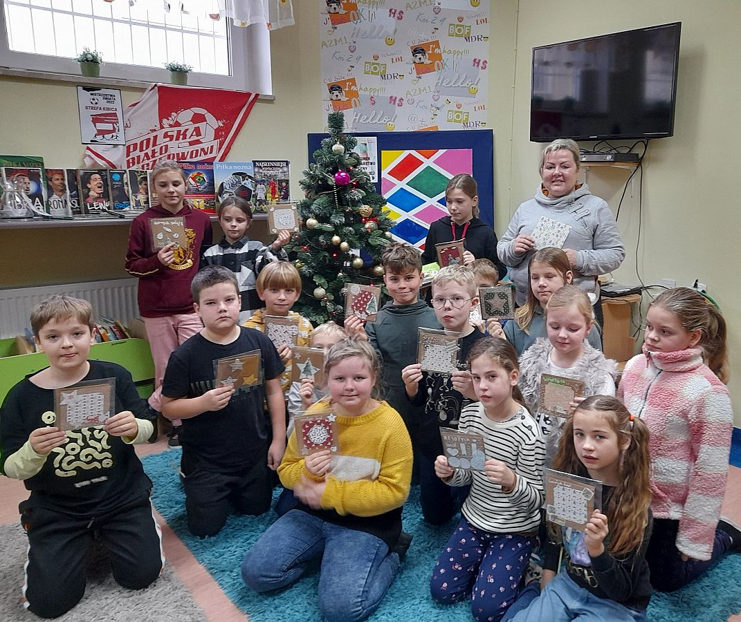Zbliżające się święta Bożego Narodzenia są doskonałą okazją do podarowania najbliższym kartek świątecznych. W piątek, w bibliotece uczniowie z klasy 3 a mieli okazję wykonać własnoręcznie kartki świąteczne. Z sercem wykonane i pięknie zapakowane rękodzieła z pewnością uradują najbliższych.