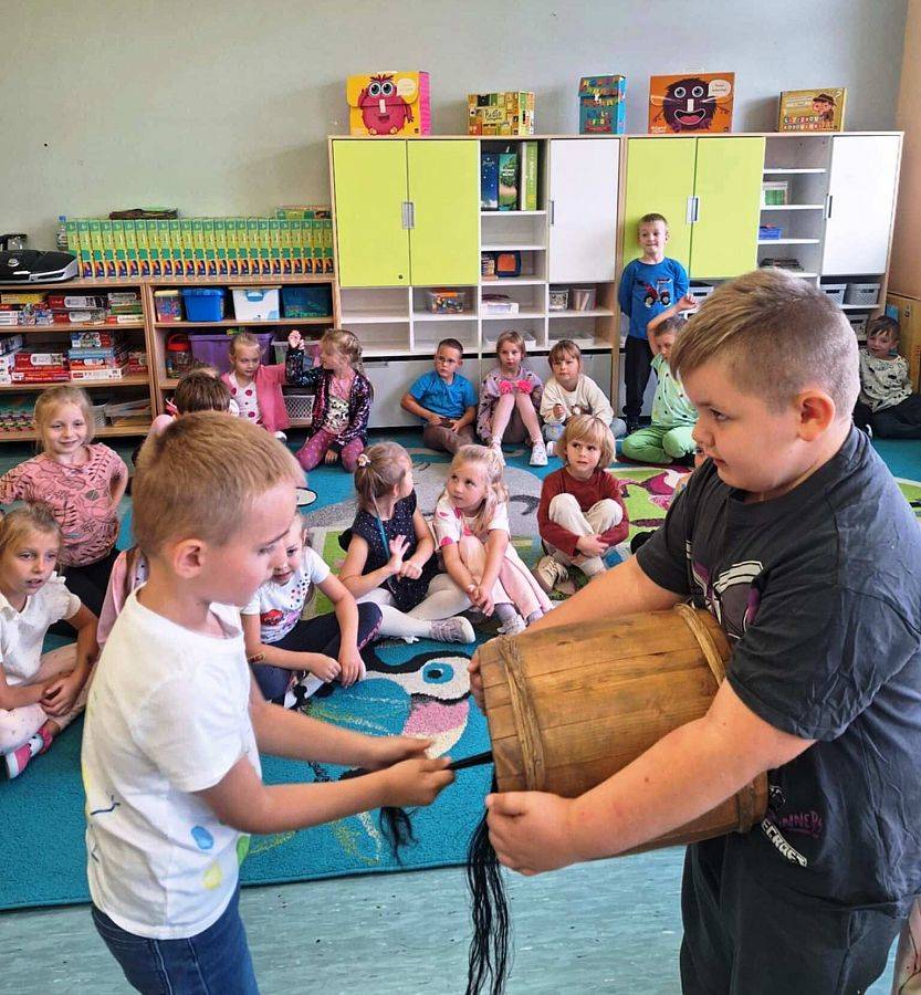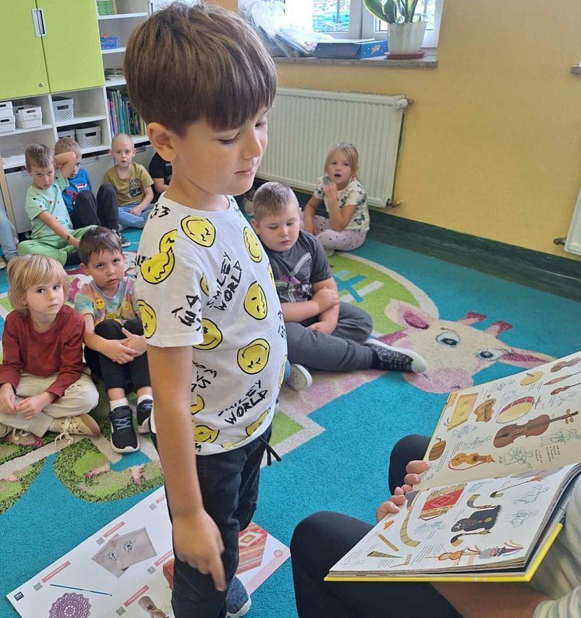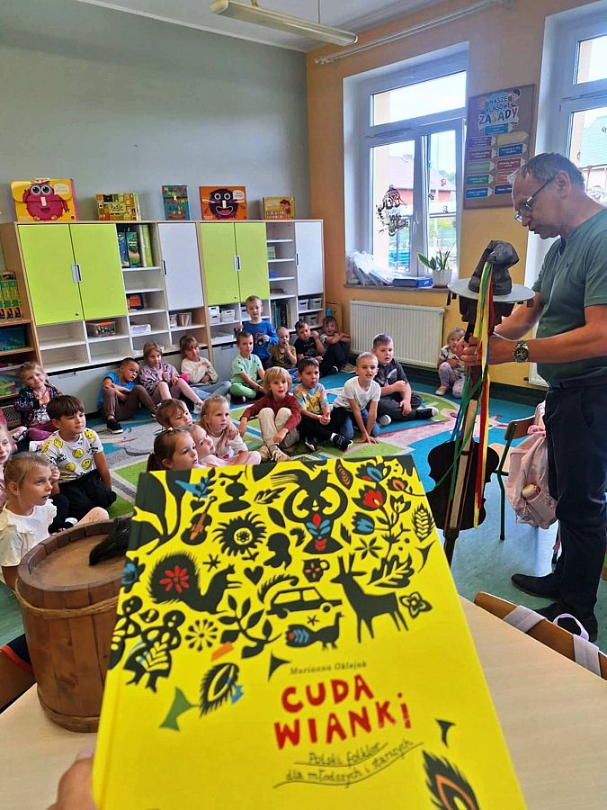 Pan Sławek – nauczyciel muzyki, który z pomocą książki „Cuda i wianki” wprowadził dzieci w świat folkloru. Największą atrakcją było poznanie niezwykłych instrumentów – diabelskich skrzypiec i burczybasa, na których przedszkolaki mogły spróbować swoich sił.