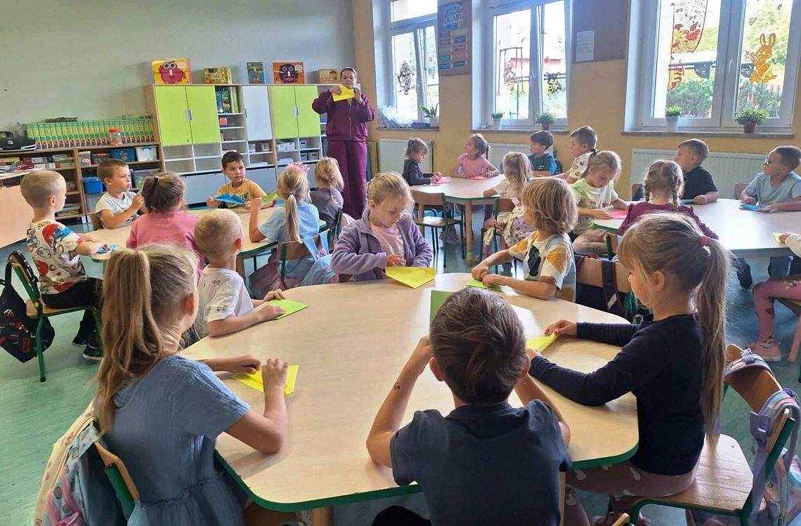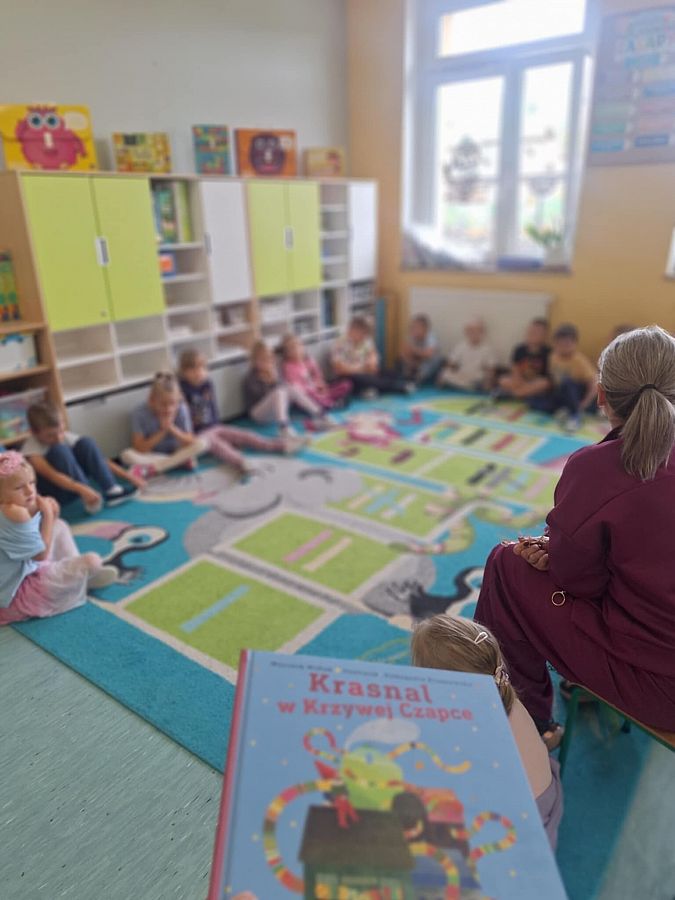 Pani Kasia Pajączkowska rozmawiała z dziećmi o czytaniu, marzeniach i ich spełnianiu. Mali słuchacze poznali fragmenty książki „Krasnal w krzywej czapce”, a następnie własnoręcznie wykonali papierowe czapki.