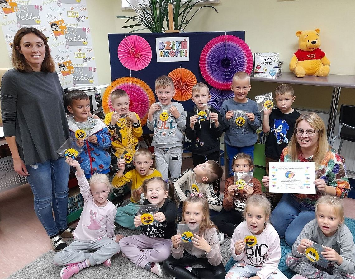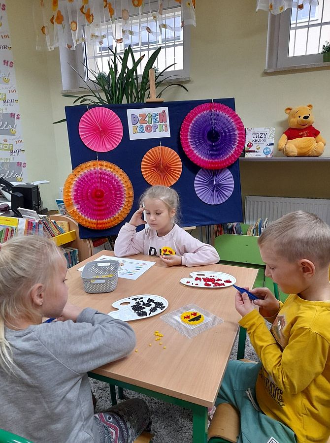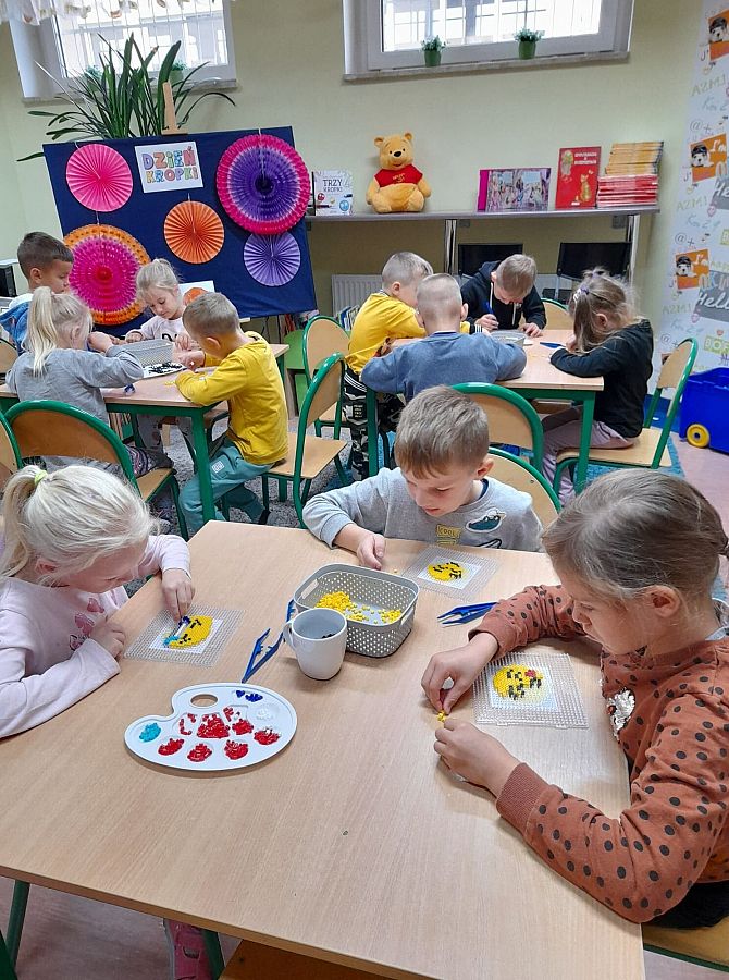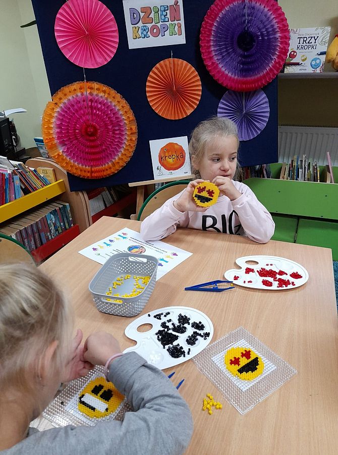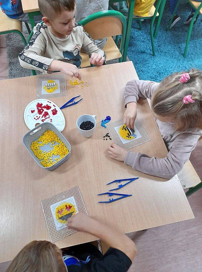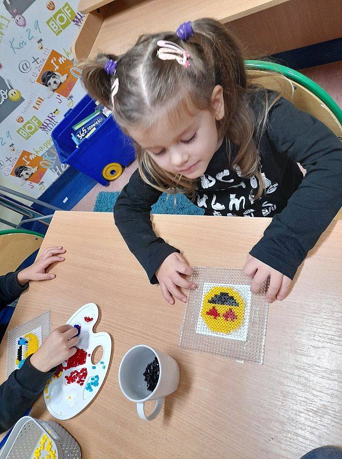 Okazją do pierwszego spotkania był zbliżający się Dzień Emotikona (19. 09). „Buźki” , bez których ciężko jest już sobie wyobrazić komunikację, zwłaszcza w Internecie, zawładnęły w piątek biblioteką. A to za sprawą przedszkolaków z 0B, które ćwicząc paluszki, układały, przekładały i emotki wyczarowywały. Tworzyły pomysłowe mozaiki, wykorzystując do tego koraliki hama.
