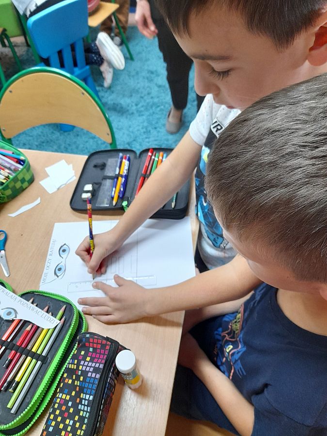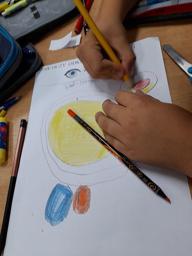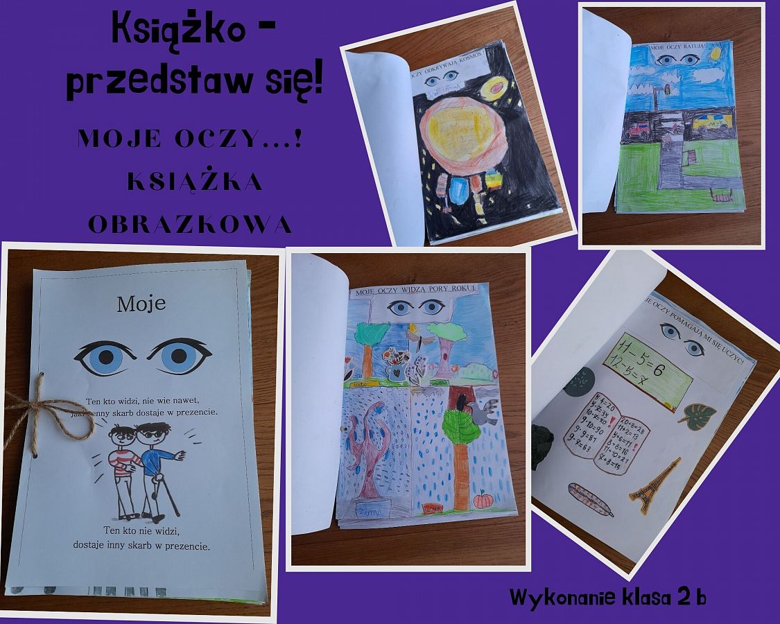 Uczniowie z klasy 2 b, do których skierowany jest projekt, przedstawia Państwu książkę obrazkową pt. „Moje oczy”. Książkę, wykonaną według własnego pomysłu, na podstawie książki pt. „Oczy” Iwony Chmielewskiej, wzruszającej opowieści o sztuce patrzenia, darze widzenia i sile zmysłów.