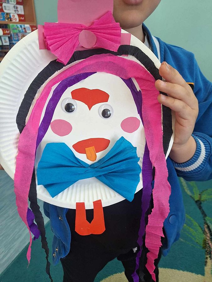 Po lekturze maluchy zabrały się za tworzenie klaunowych portretów, dając upust swojej wyobraźni! W przeprowadzeniu zajęć pomogły dziewczyny z kółka bibliotecznego – Marcelina, Edyta i Amelia, za co serdecznie im dziękujemy!