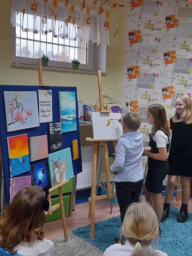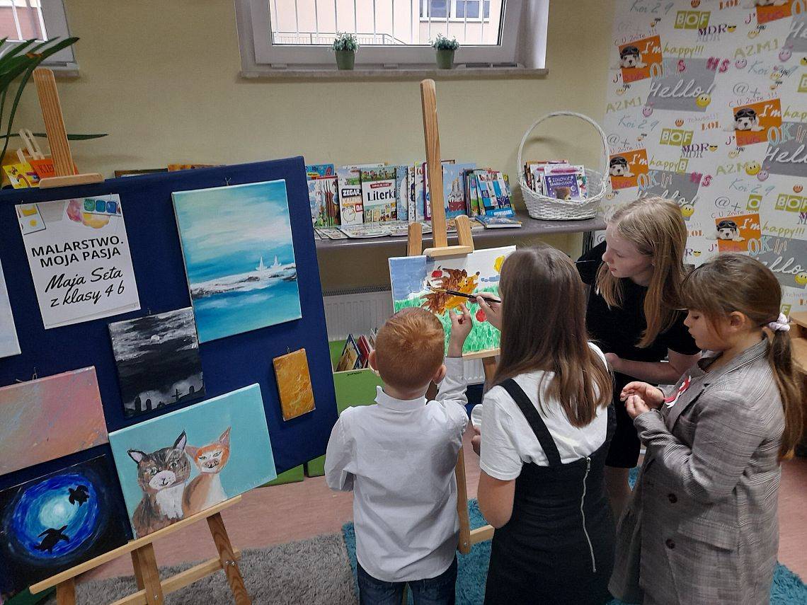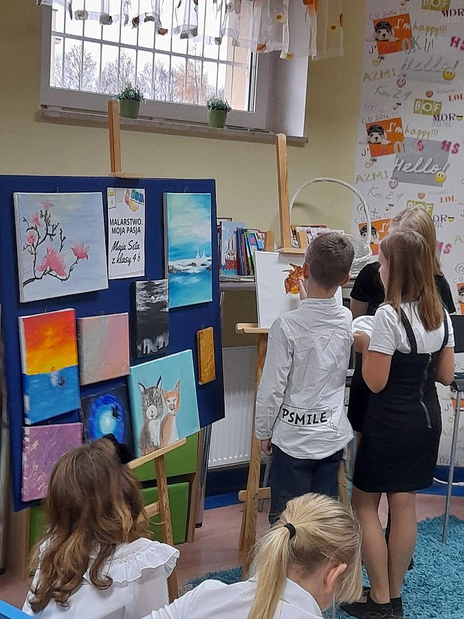 Po raz kolejny w bibliotece szkolnej w Łęczycach przygotowaliśmy wystawę twórczości uczniowskiej. Z przyjemnością zaprezentowaliśmy obrazy malowane na płótnie, autorstwa Mai Seta z klasy 4 b. Uczennica interesuje się malarstwem od trzech lat. W wolnej chwili tworzy pejzaże, kwiaty oraz abstrakcje. Swoimi płótnami obdarowuje rodzinę i znajomych.