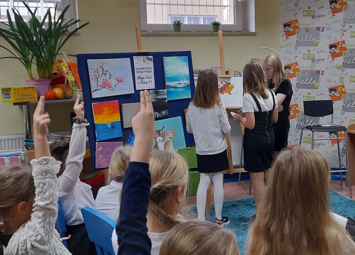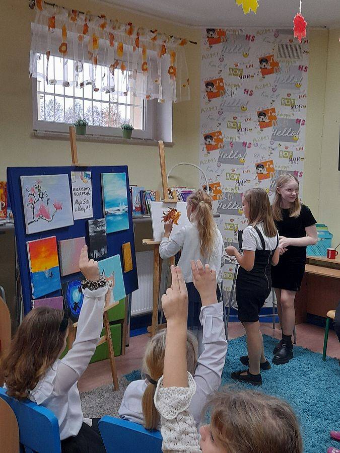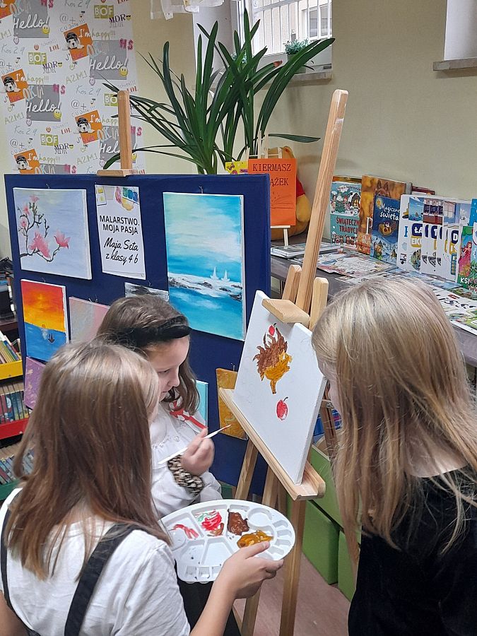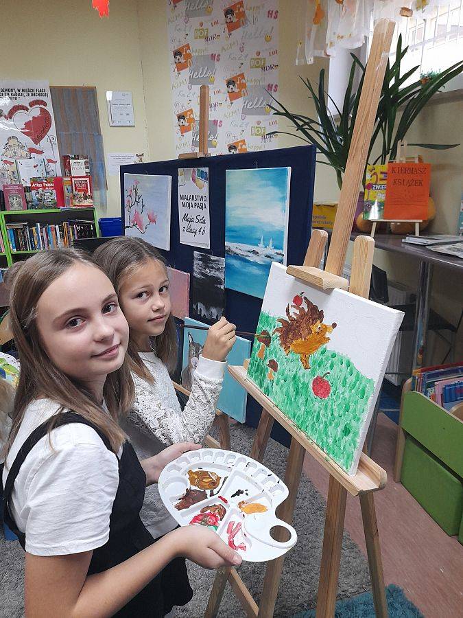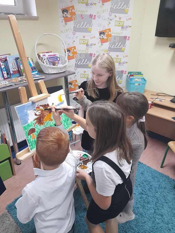 10 listopada Maja spotkała się w bibliotece z uczniami z klasy 2 b i przygotowała dla nich warsztaty plastyczne. Z okazji Międzynarodowego Dnia Jeża dzieci wspólnie namalowały jeża. Twórczość Mai szybko przypadła im do gustu i ze skupieniem malowały rysunek, kierując się wskazówkami starszej koleżanki.