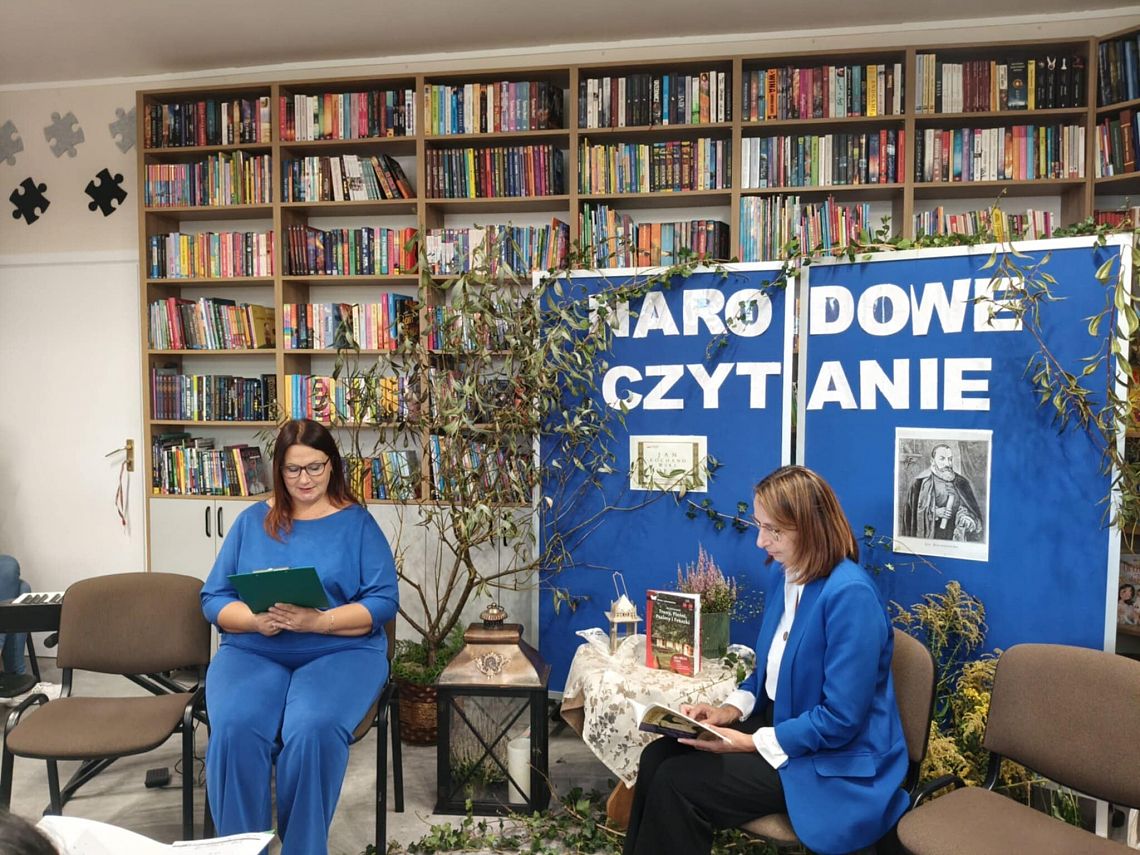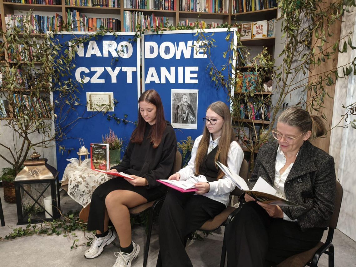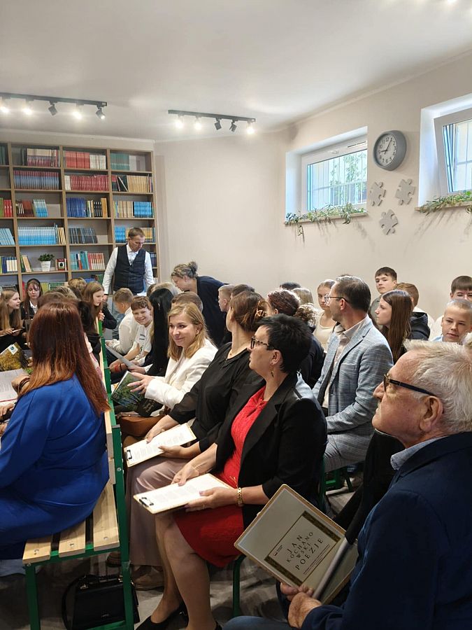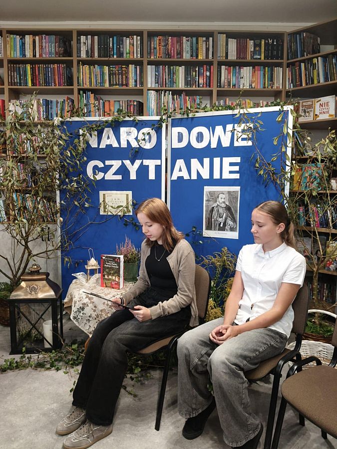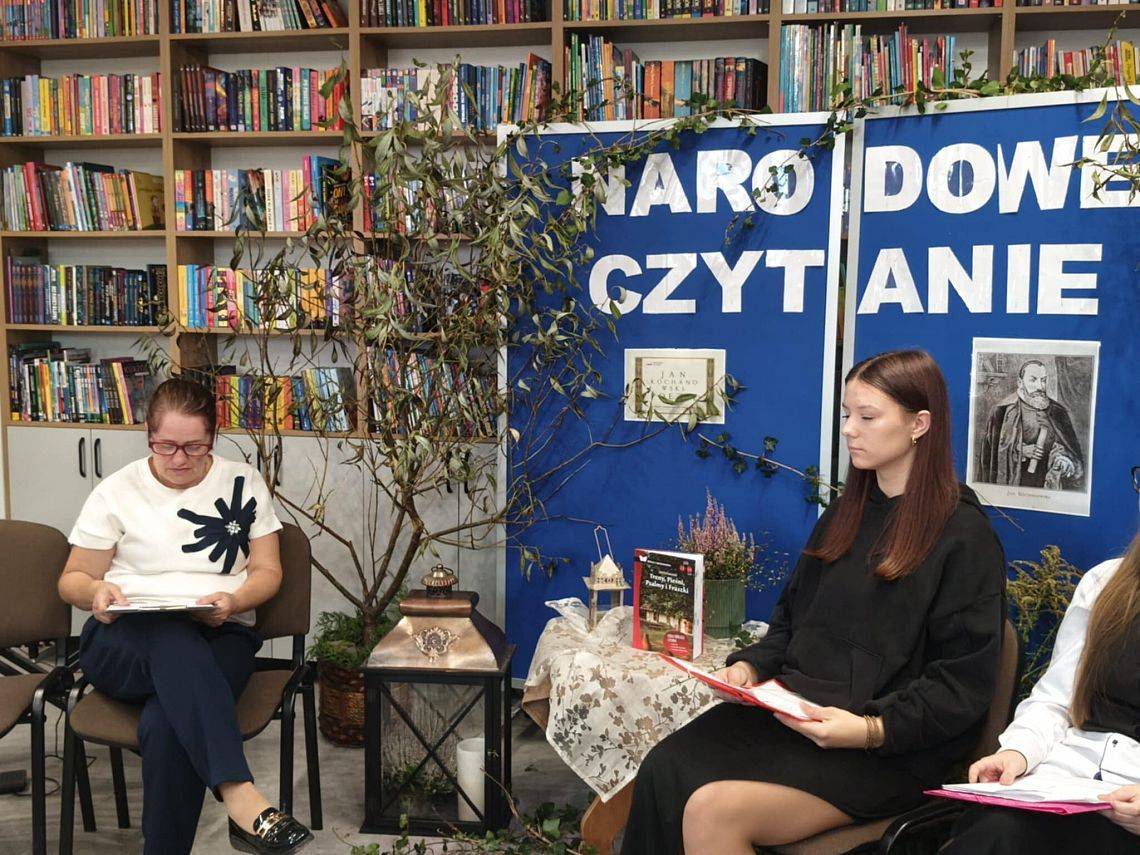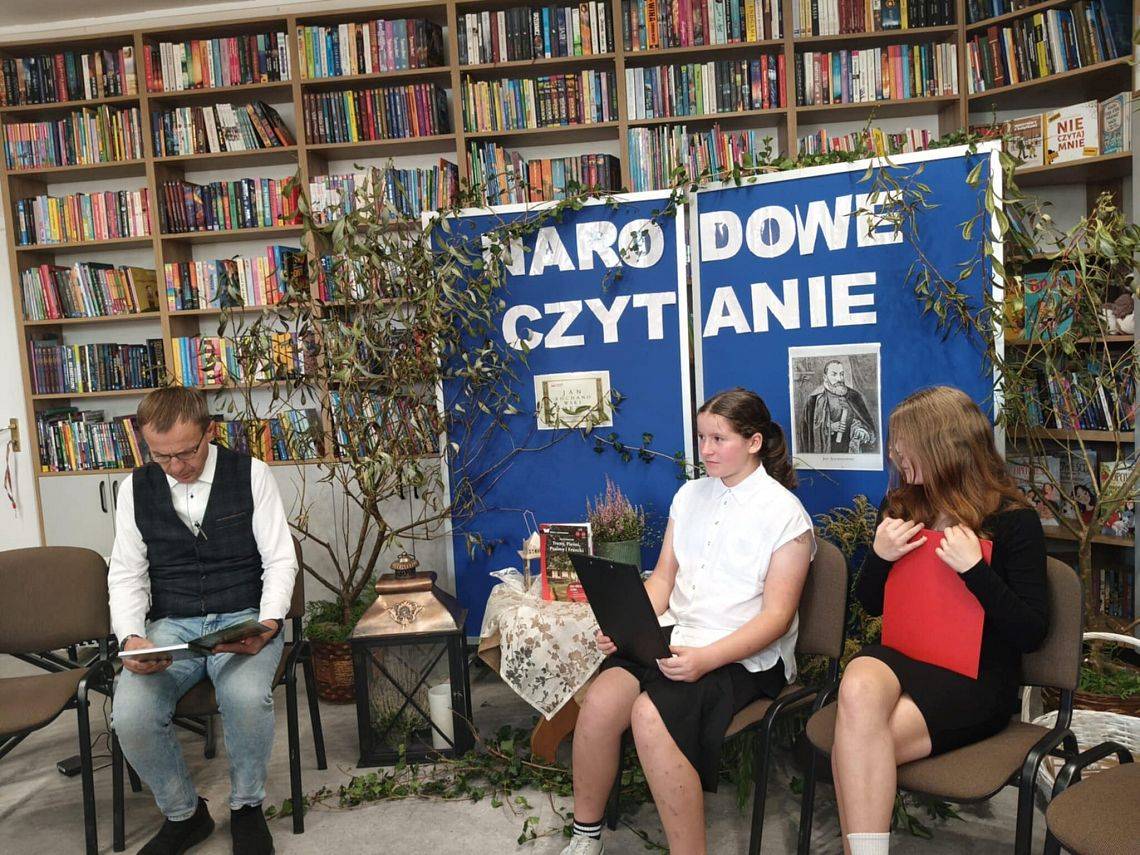 W odnowionej bibliotece odbyło się wyjątkowe spotkanie z okazji Narodowego Czytania 2025 oraz Ogólnopolskiego Dnia Głośnego Czytania. Gości powitała Dyrektor szkoły, Mirosława Wieczorek, a następnie wspólnie odkrywaliśmy twórczość Jana Kochanowskiego. Swoje interpretacje poezji Kochanowskiego zaprezentowali: