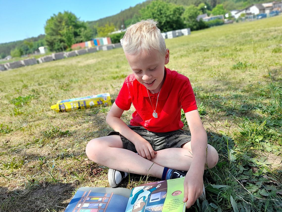 Do pobicia rekordu czytania swoją cegiełkę dołożyła również 3a, która postawiła w tym dniu na plenerowe czytanie. Zielony plac koło szkoły pozwolił im na oddanie się przyjemnej lekturze oraz integrujące zabawy kreatywno - ruchowe.