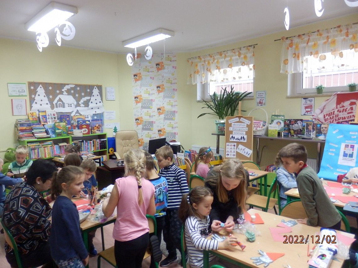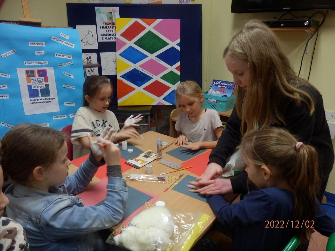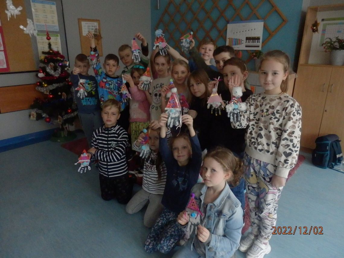 Początek grudnia to najlepszy czas na wykonanie ozdób choinkowych. Takowe tworzyli dzisiaj uczniowie z klasy 2 a, pod kierunkiem uczennicy z klasy 4 b, Aleksandry. Ola zaproponowała zgromadzonym wykonanie bombki, upamiętniającej kształt dłoni pomalowanej białą farbką i odbitej na czarnej kartce. Uczniom bardzo spodobał się ten pomysł i po godzinie pełnych radości i twórczości zajęć powstały piękne i wyjątkowe ozdoby choinkowe.