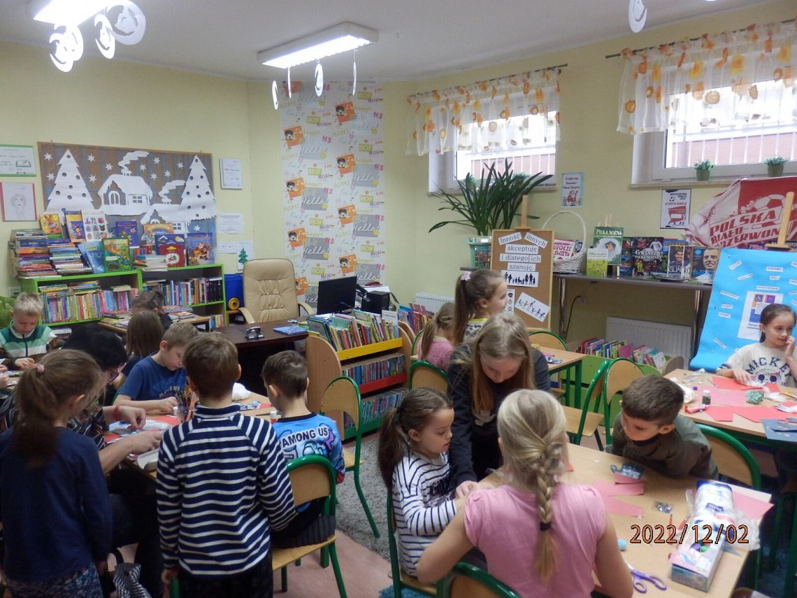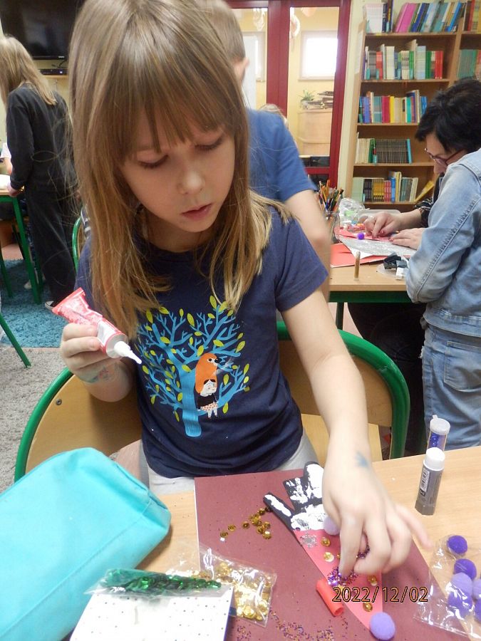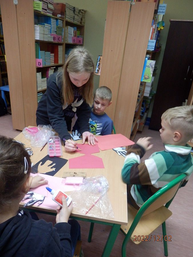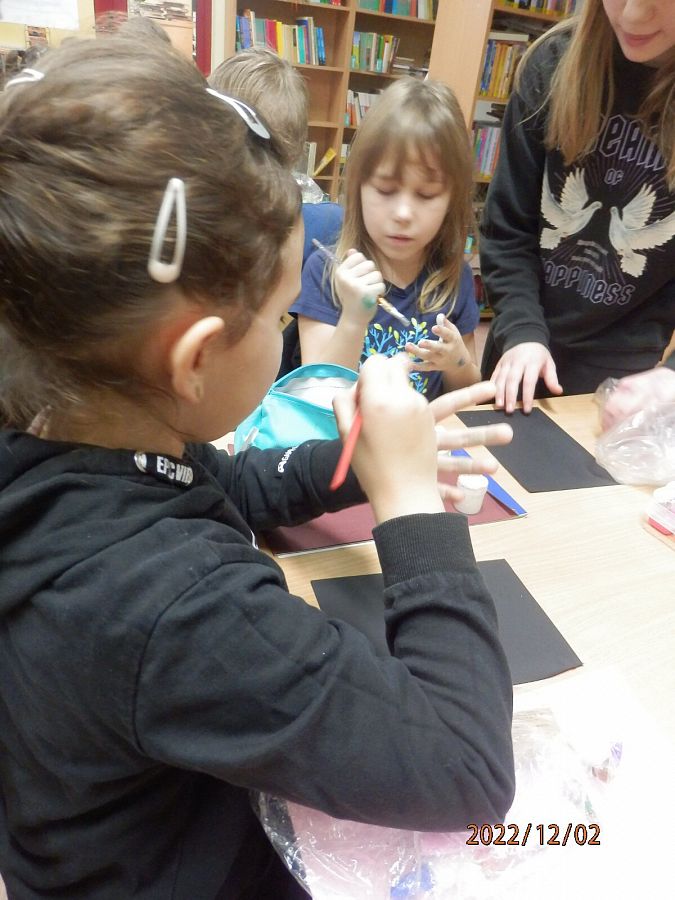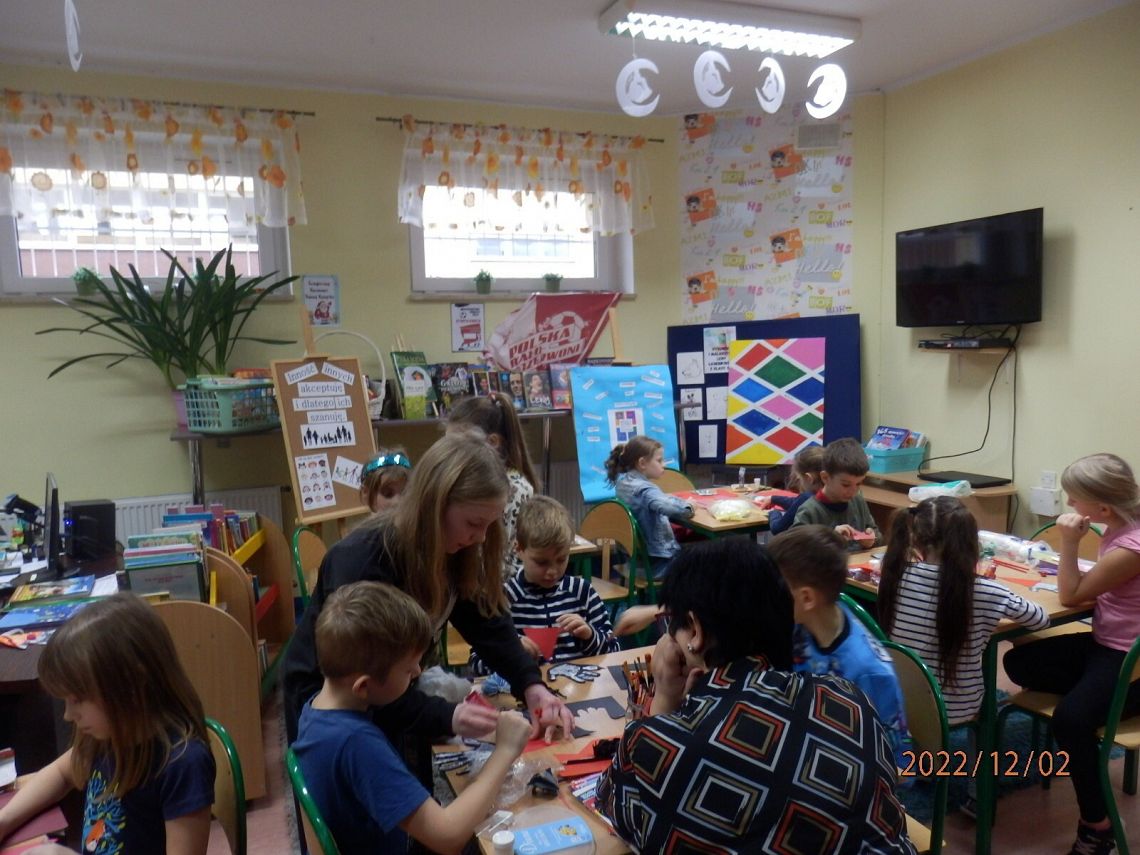 Początek grudnia to najlepszy czas na wykonanie ozdób choinkowych. Takowe tworzyli dzisiaj uczniowie z klasy 2 a, pod kierunkiem uczennicy z klasy 4 b, Aleksandry. Ola zaproponowała zgromadzonym wykonanie bombki, upamiętniającej kształt dłoni pomalowanej białą farbką i odbitej na czarnej kartce. Uczniom bardzo spodobał się ten pomysł i po godzinie pełnych radości i twórczości zajęć powstały piękne i wyjątkowe ozdoby choinkowe.