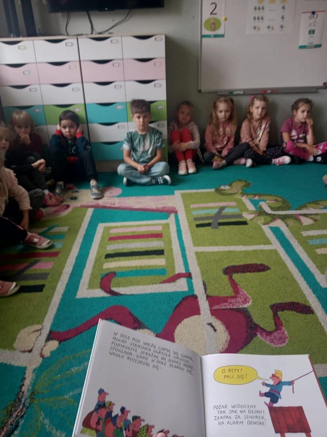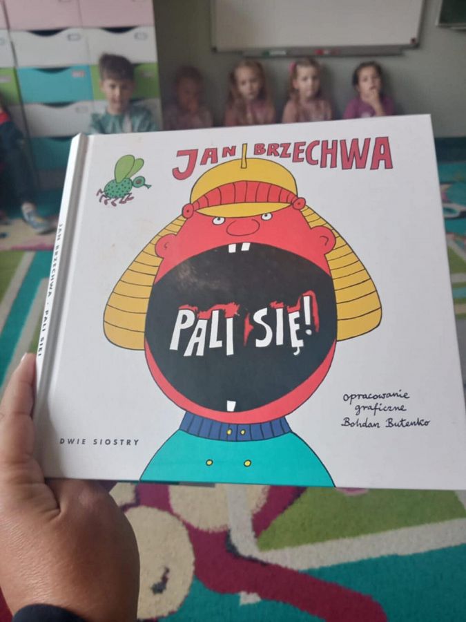 Dziś dzieci z grupy 0A poznały kolejną książkę z projektu „Biblioteka Przedszkolaka” – tym razem był to klasyk Jana Brzechwy „Pali się”. Idealnie się złożyło, bo akurat w szkole odbył się… próbny alarm przeciwpożarowy! Literatura i praktyka poszły dziś w parze – najpierw dzieci dowiedziały się z książki, co robić, gdy pali się naprawdę, a potem przećwiczyły to w szkolnych warunkach. Na koniec, tradycyjnie już, przedszkolaki uzupełniły kolejne strony w swoim lekturniku.