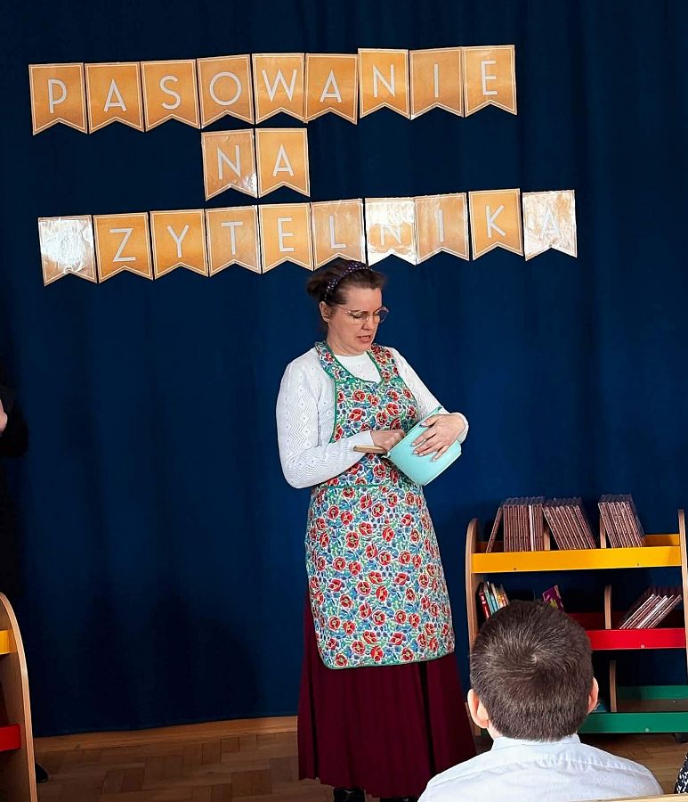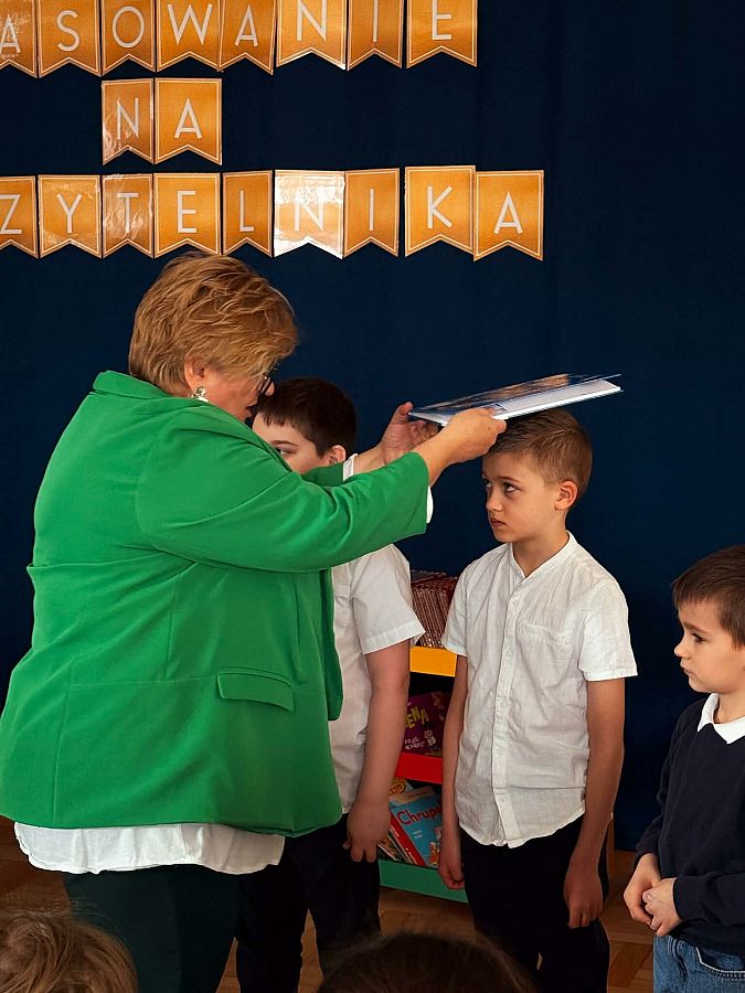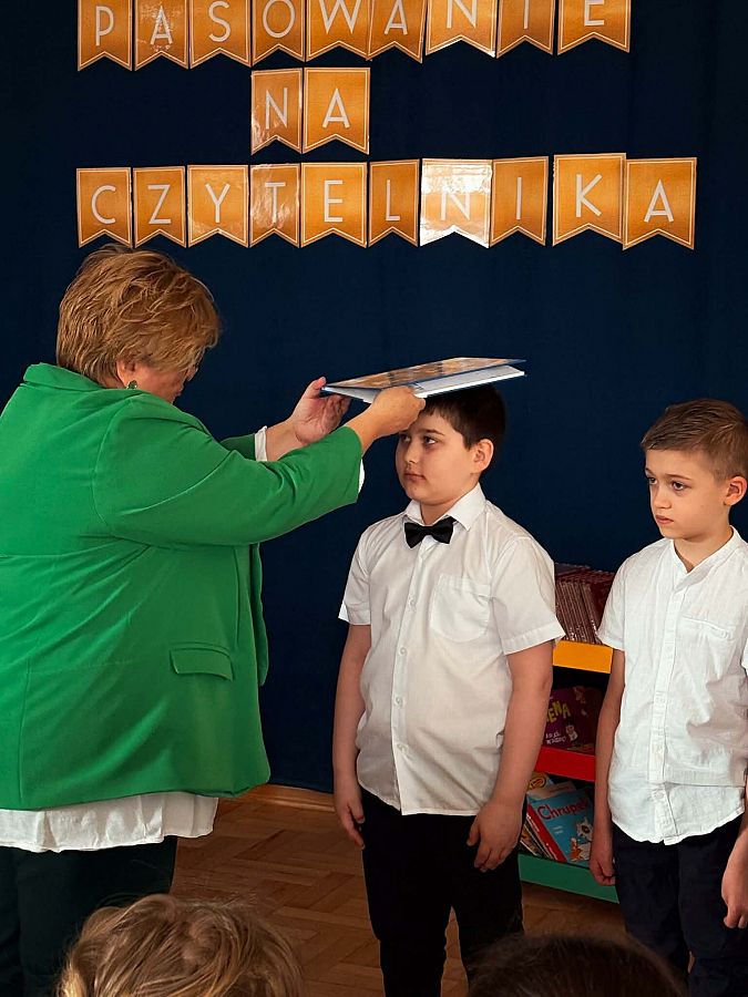Podczas uroczystości dzieci wysłuchały piosenek „Fantazja” oraz „Piosenka o czytaniu książek”. Najważniejszym momentem było symboliczne pasowanie książką przez Panią Dyrektor – od tej chwili pierwszoklasiści stali się pełnoprawnymi czytelnikami. Każde dziecko otrzymało również upominek.