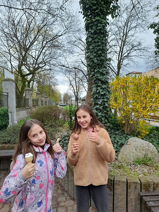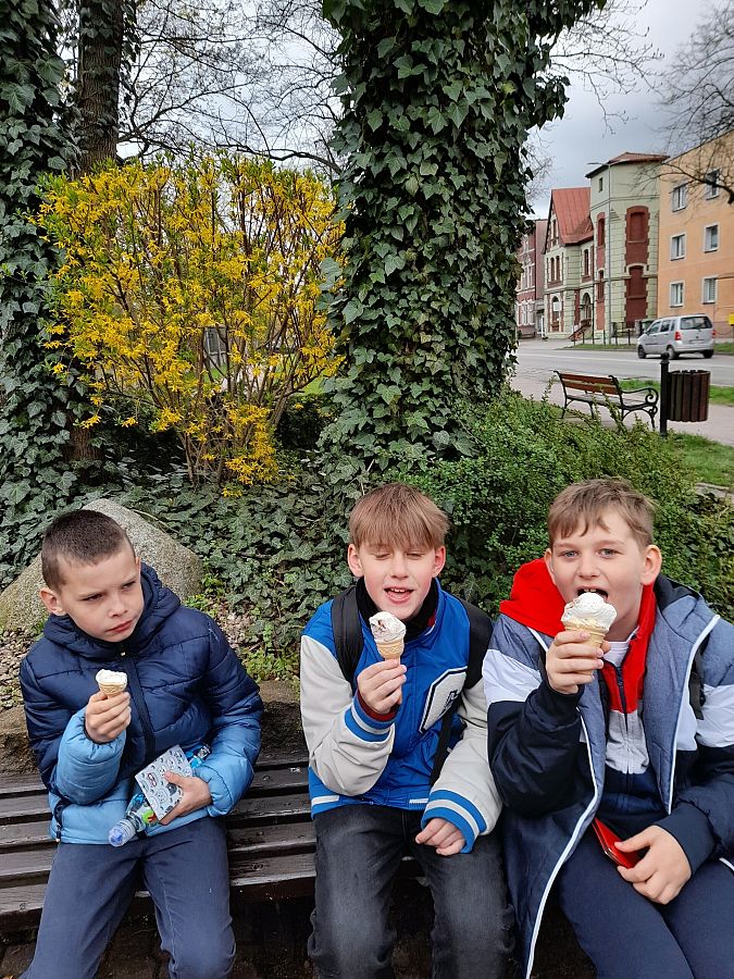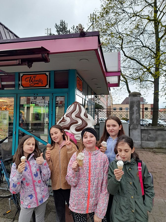 Po pysznym posiłku, za który bardzo serdecznie dziękujemy właścicielowi, mali podróżnicy zjedli lody (prawie włoskie:). Przespacerowali się po Lęborku, zrobili zakupy w sklepie TEDi. Obkupieni w różne cudeńka i bardzo zadowoleni wrócili pociągiem do Godętowa, a potem piechotką do szkoły.