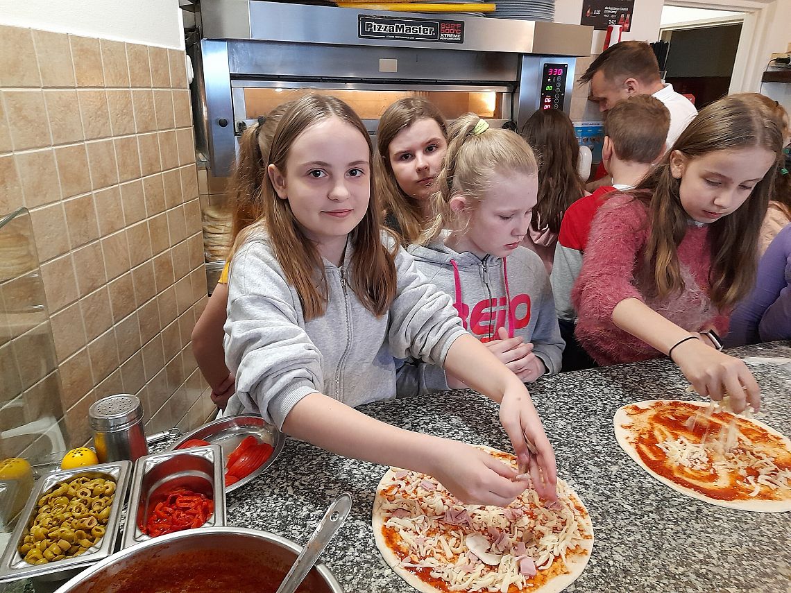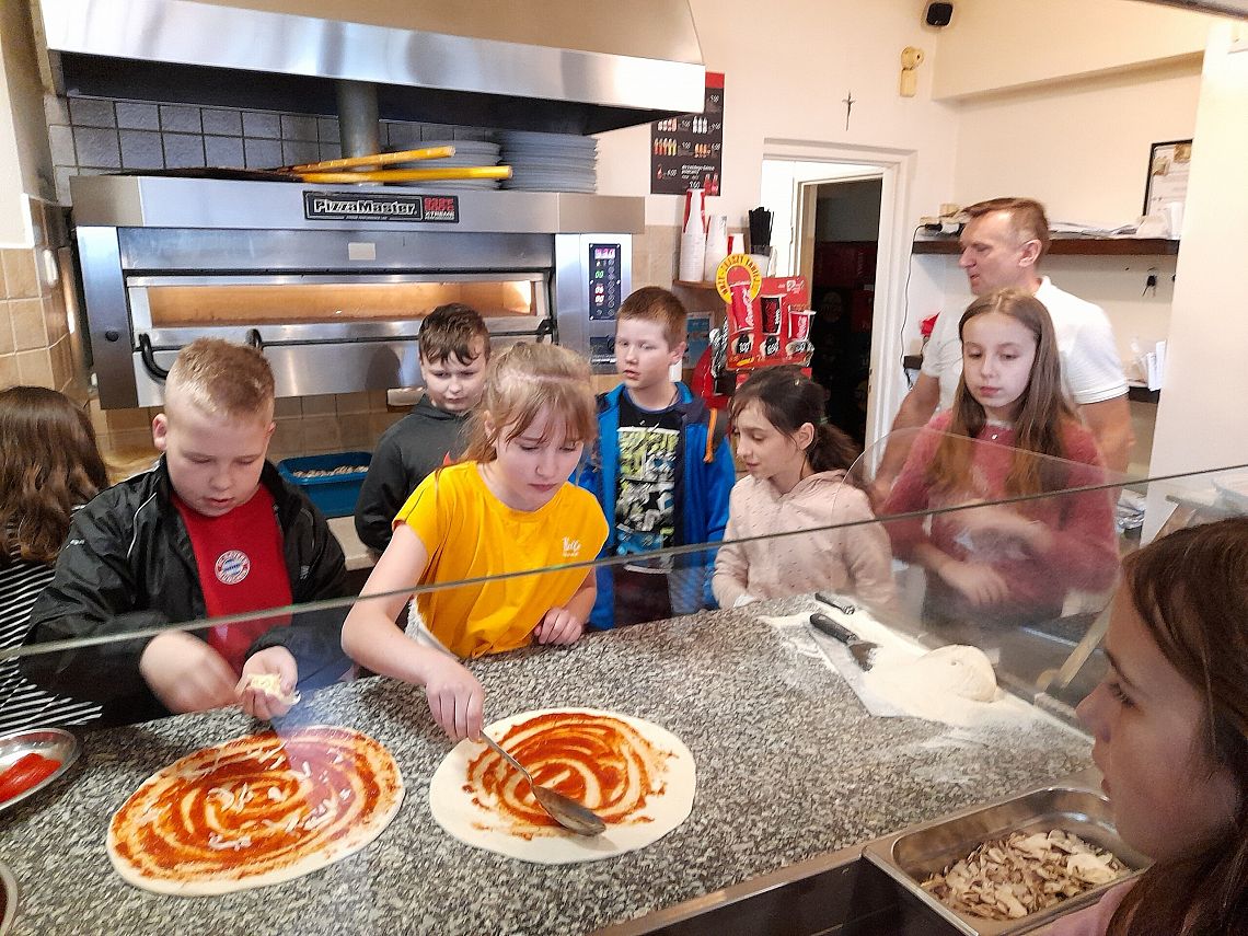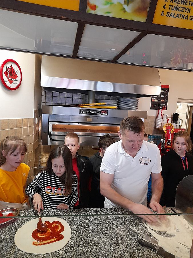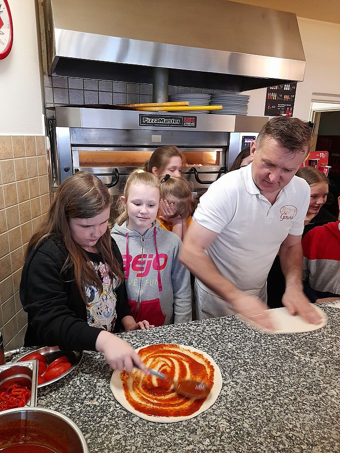 Realizując kolejne zadania z projektu edukacyjnego „Podróże małe i duże”, w module wiosennym uczniowie z klasy 4 b poznają Włochy. Wcześniej przypomnieli sobie przygody psa Lampo, który niegdyś podróżował pociągiem, uzupełnili Dzienniczki Podróżnika…i dzisiaj wybrali się pociągiem do Lęborka. Na zaproszenie właściciela Pizzerii „Gowid” odbyli warsztaty robienia pizzy. Dzieci, po zapoznaniu się z techniką wykonania pizzy, wcieliły się w rolę kucharzy i przyrządziły pizze według własnych upodobań smakowych. Włoskie placki wyglądały cudownie, a jeszcze lepiej smakowały.