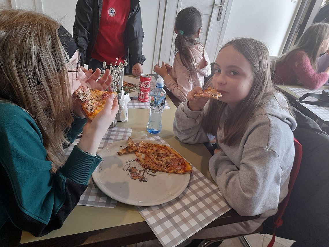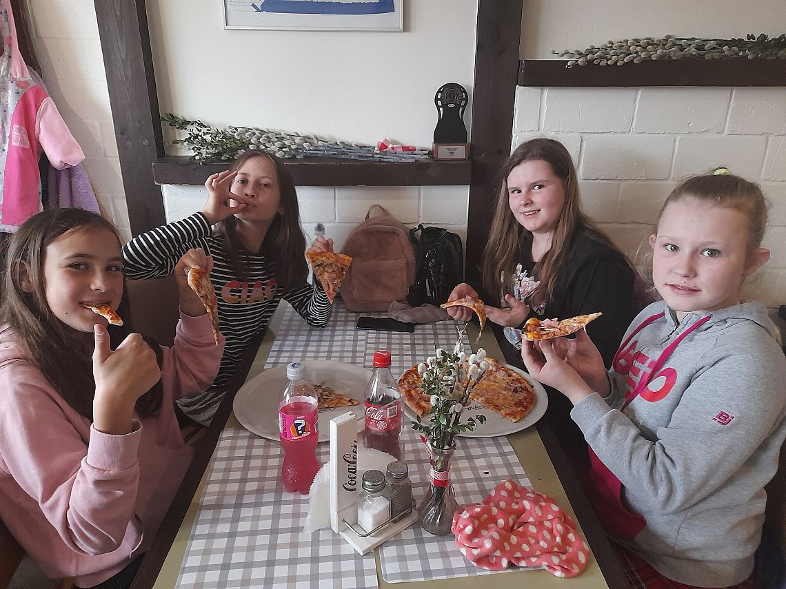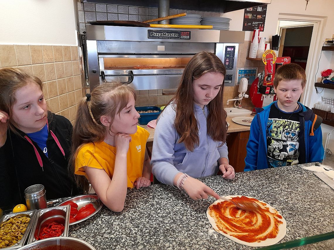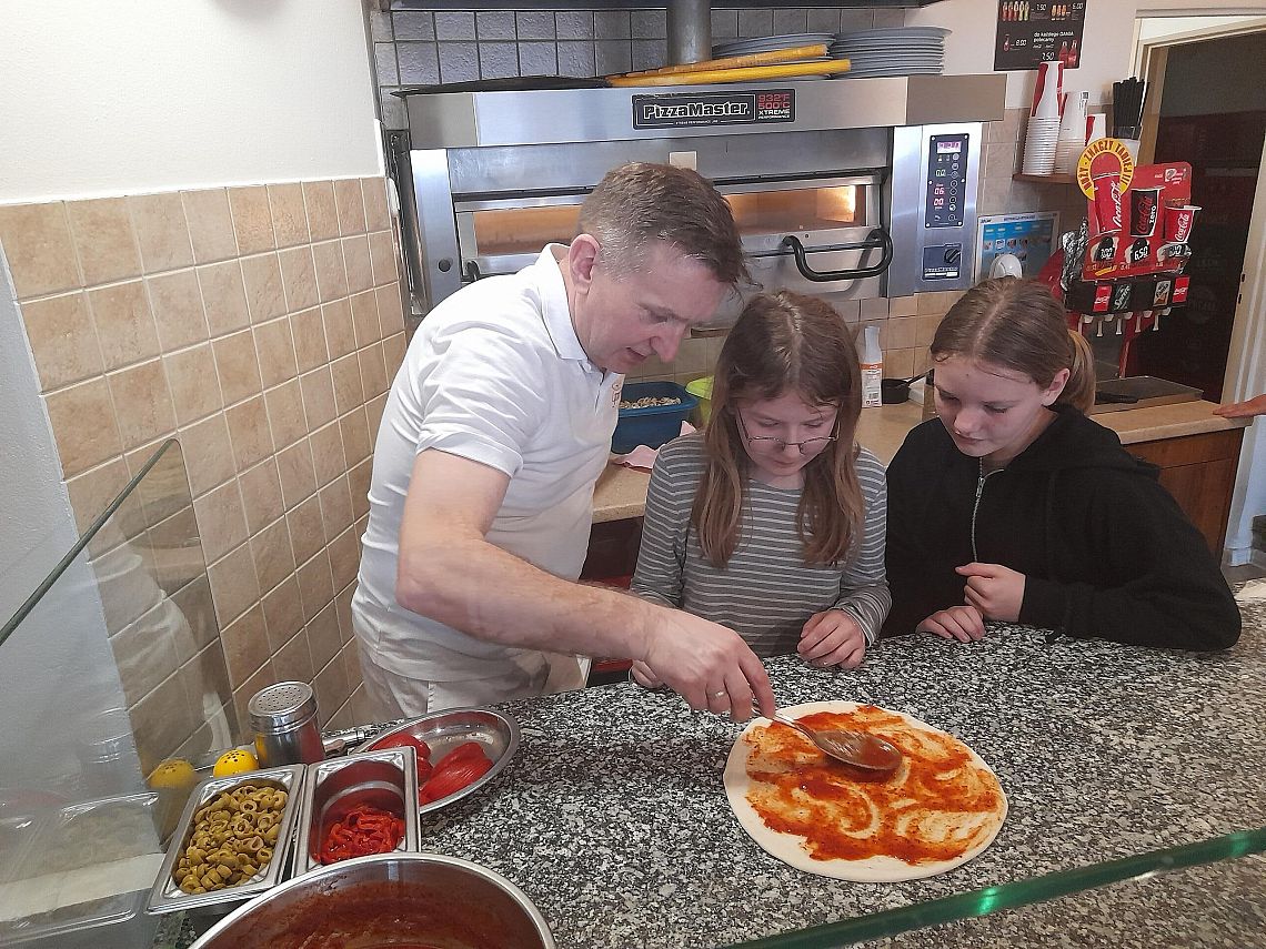 Realizując kolejne zadania z projektu edukacyjnego „Podróże małe i duże”, w module wiosennym uczniowie z klasy 4 b poznają Włochy. Wcześniej przypomnieli sobie przygody psa Lampo, który niegdyś podróżował pociągiem, uzupełnili Dzienniczki Podróżnika…i dzisiaj wybrali się pociągiem do Lęborka. Na zaproszenie właściciela Pizzerii „Gowid” odbyli warsztaty robienia pizzy. Dzieci, po zapoznaniu się z techniką wykonania pizzy, wcieliły się w rolę kucharzy i przyrządziły pizze według własnych upodobań smakowych. Włoskie placki wyglądały cudownie, a jeszcze lepiej smakowały.