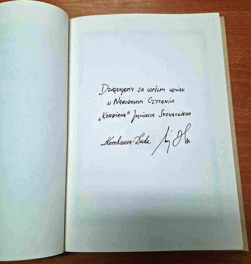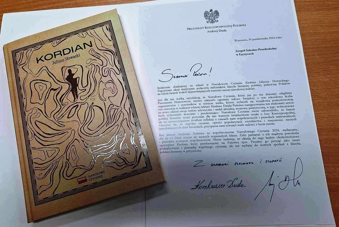 Miło nam poinformować, że Szkoła otrzymała podziękowanie od Prezydenta RP Andrzeja Dudy za zorganizowanie wydarzenia w ramach Narodowego Czytania "Kordiana". Otrzymaliśmy również pamiątkowy egzemplarz „Kordiana” Juliusza Słowackiego. Dziękujemy wszystkim, którzy przyczynili się do tego sukcesu!