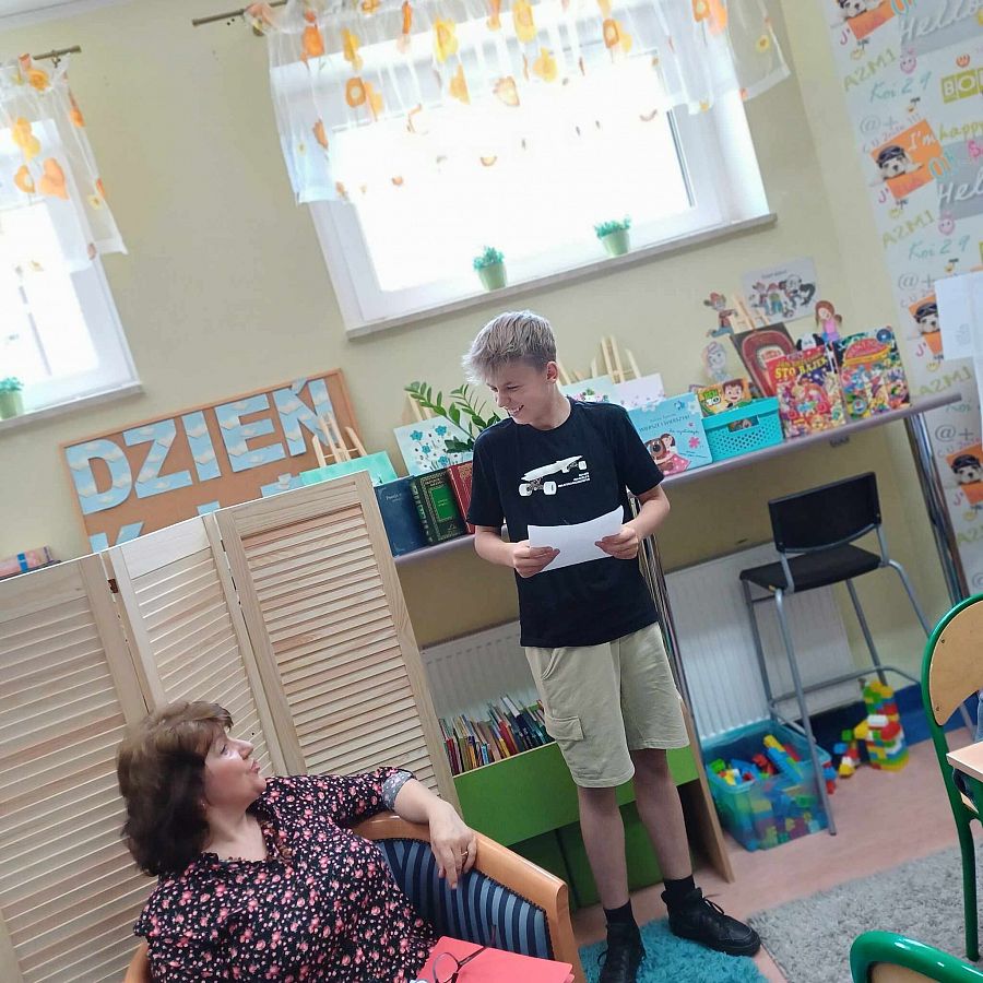 Po zakończeniu części autorskiej, uczniowie podzieleni na grupy, próbowali swoich sił w tworzeniu poezji. Każda grupa miała okazję napisać własne wierszyki, inspirując się słowami i historiami pani Marii.