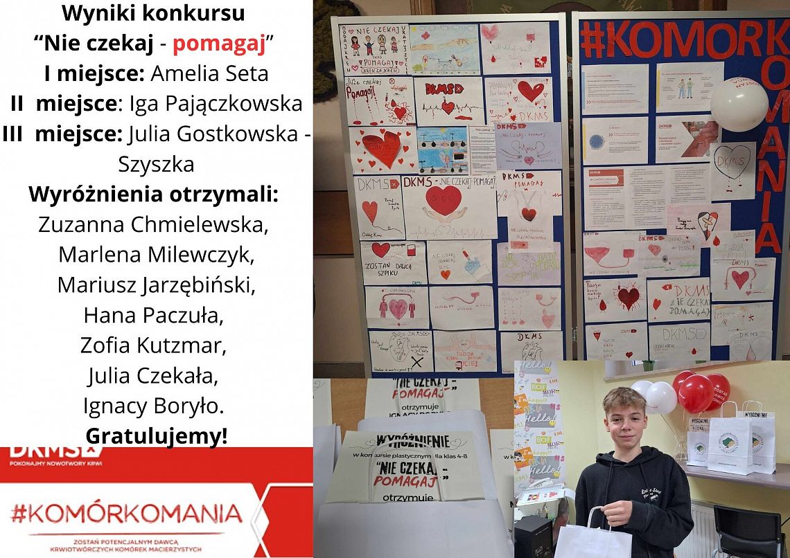 Z radością informujemy, że rozstrzygnięto konkurs plastyczny „Nie czekaj – pomagaj!”, organizowany w ramach Narodowego Programu Rozwoju Czytelnictwa (NPRCz) dla uczniów klas 4-8. Konkurs miał na celu promowanie idei dawstwa szpiku oraz zachęcenie uczniów do niesienia pomocy innym.