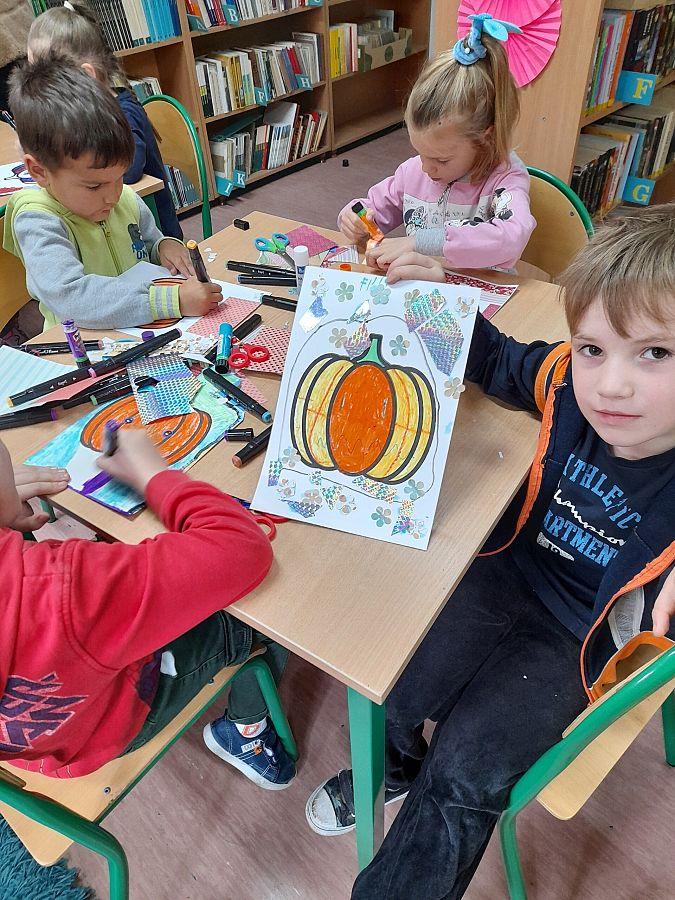 Święto Dyni było kolejną okazją do spotkania z przedszkolakami w ramach projektu „Sensoryczny kogel - mogel”. Na początku dzieci poznały Franklina i jego przyjaciół, którzy przygotowywali się do parady przebierańców z okazji święta duchów. Seria książek o Franklinie, porusza niezwykle ważne sprawy z życia każdego kilkulatka, a książka „Franklin i święto duchów” z tego cyklu, okazała się nie być wcale taką strrrraszną, na jaką wskazywał sam tytuł;)