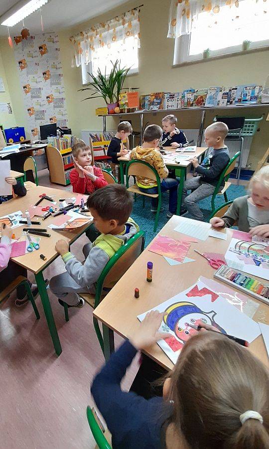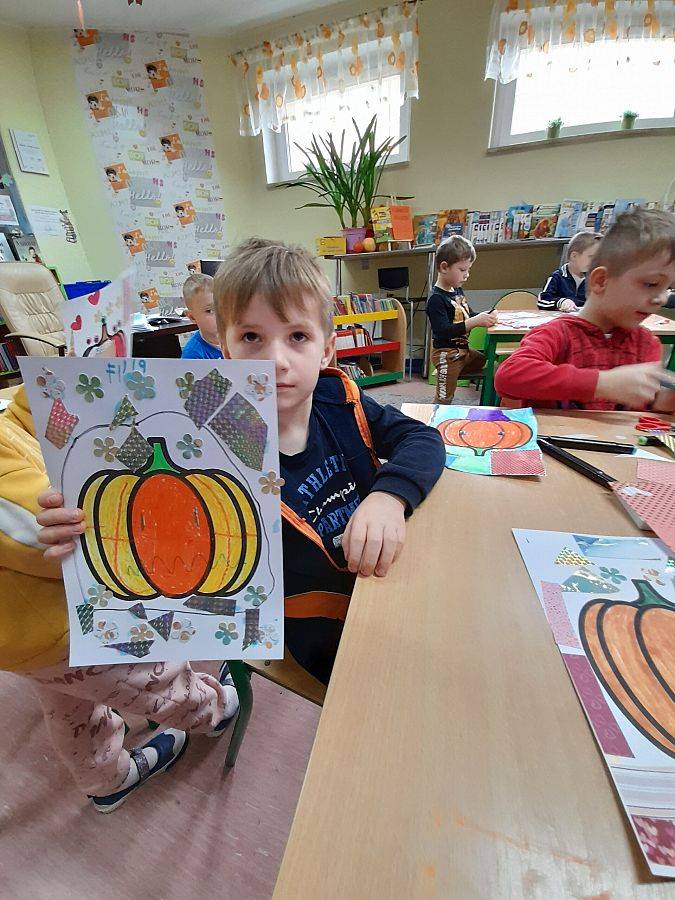 W związku z tym, że „Sensoryczny kogel - mogel jest projektem plastycznym, nie mogło zabraknąć również prac ręcznych związanych z bohaterką spotkania. Dzieci malowały i wyklejały różnymi fakturami obrazki z dynią, a niektórym warzywnym pięknościom nadały nawet imiona:)