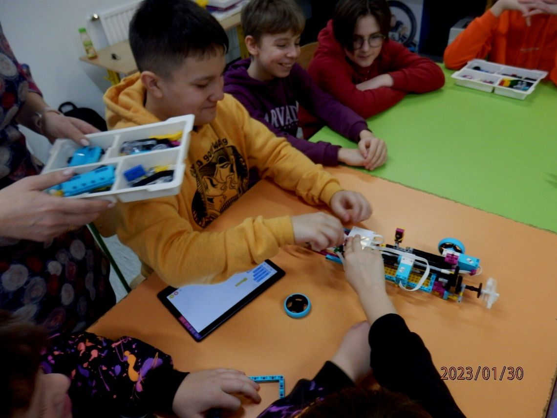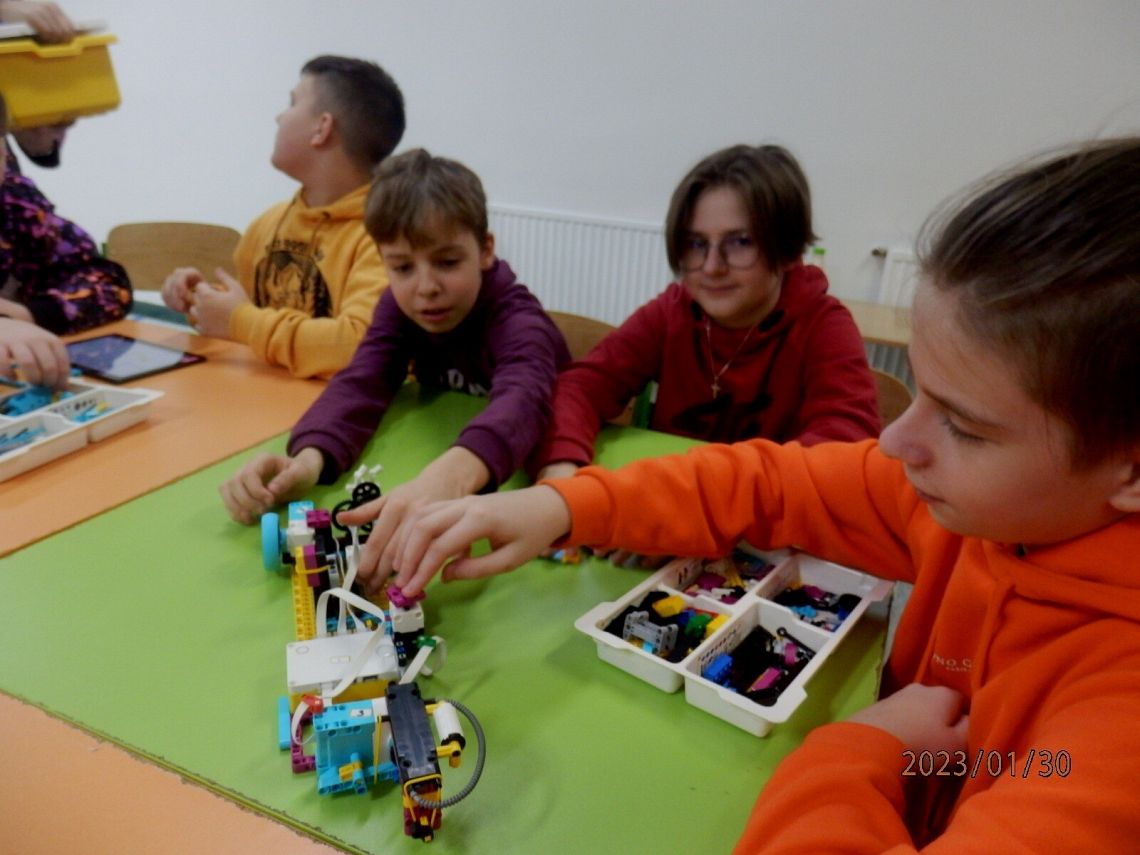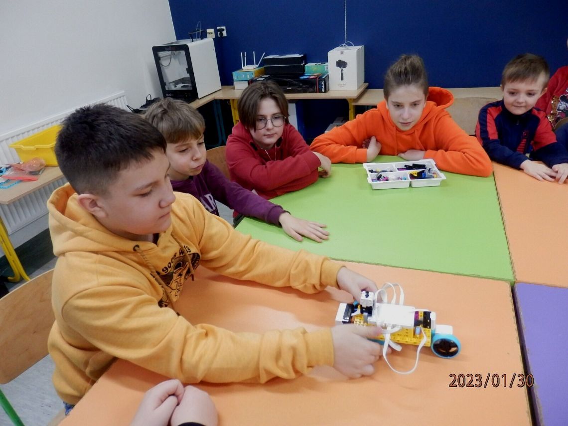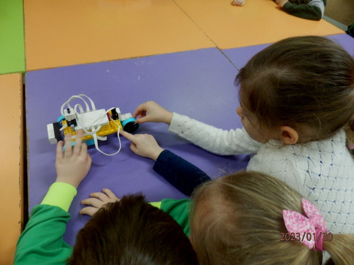Podczas zajęć dzieci, na początku przyglądały się sztuce programowania i budowania pojazdów z klocków Lego Education, w wykonaniu starszych kolegów, następnie same zaangażowały się w tę kreatywną zabawę.