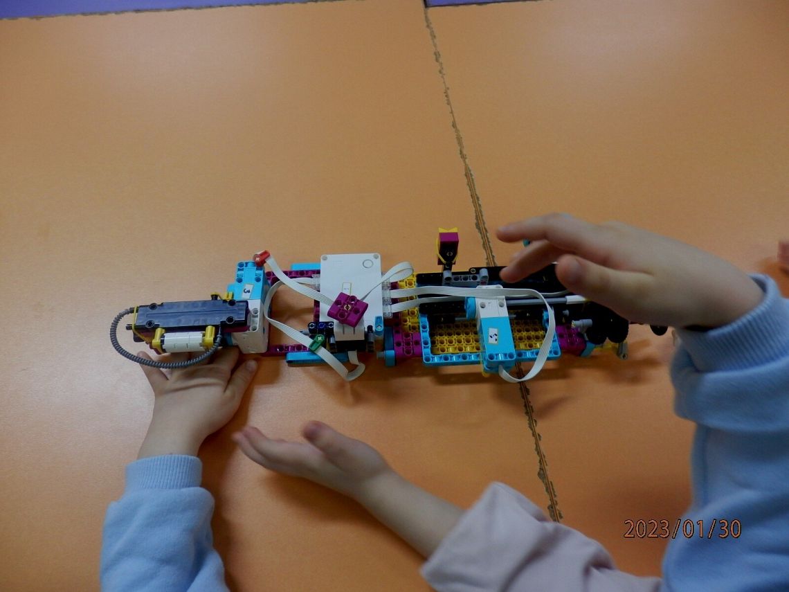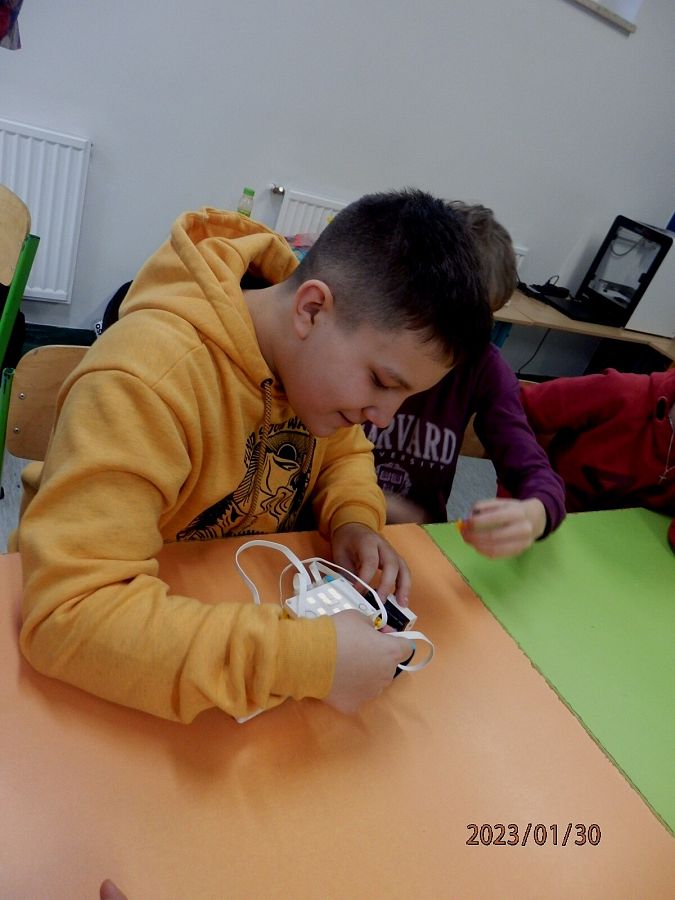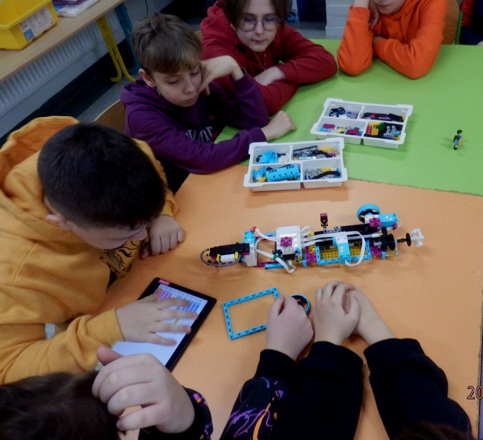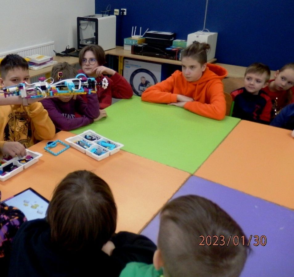 Podczas zajęć dzieci, na początku przyglądały się sztuce programowania i budowania pojazdów z klocków Lego Education, w wykonaniu starszych kolegów, następnie same zaangażowały się w tę kreatywną zabawę.
