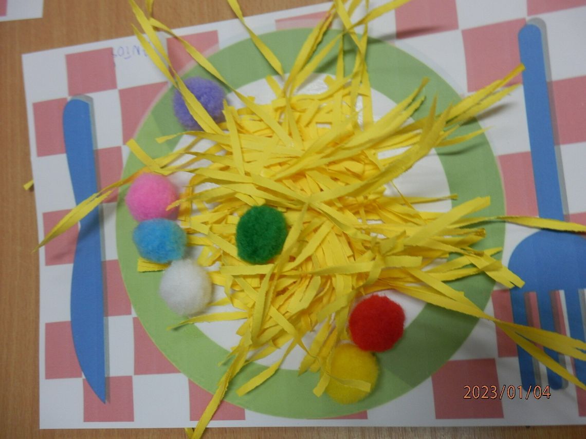 To co powiecie na oryginalne włoskie spaghetti z papieru, z dodatkiem kolorowych pulpecików – pomponików ,w wykonaniu naszych przedszkolaków? Własnoręcznie przygotowane, kolorowe, sensoryczne i niekaloryczne :)