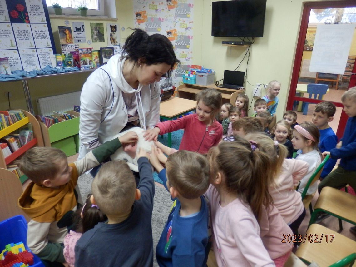 Po raz pierwszy wspomnieliśmy o kocie na spotkaniu z zerówkowiczami i Panią Katarzyną Kustra, lekarzem weterynarii z gabinetu weterynaryjnego "Karino" w Łęczycach. Mieliśmy również okazję poznać uroczego, bardzo grzecznego kociaka o imieniu ŁOBUZ :), którego właścicielem jest Julek z grupy 0A. Podczas spotkania Pani Kasia przeczytała dzieciom opowiadanie o najbardziej znanej kotce, czyli Kici Koci, a następnie przedstawiła Łobuza, niegdyś swojego pacjenta. Przekazała także wiele ciekawych informacji o kocim świecie. Przedszkolaki chętnie brały udział w spotkaniu, dzieliły się własnymi spostrzeżeniami i doświadczeniami na temat zwierząt, które posiadają w domu.