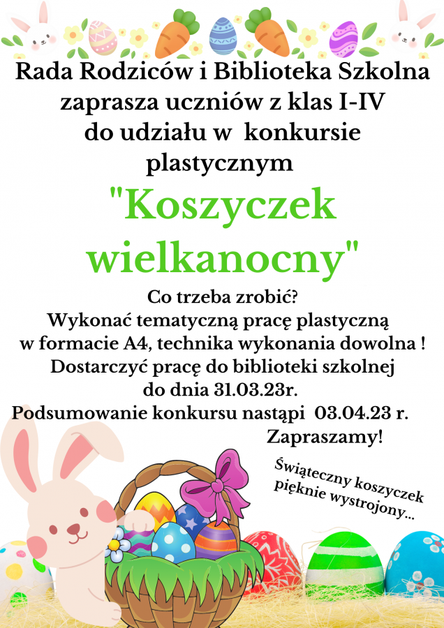 Zapraszamy uczniów z klas I-IV do udziału w konkursie pt."KOSZYCZEK WIELKANOCNY".