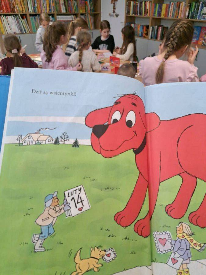Była też chwila na wspólne słuchanie książki „Walentynki Clifforda”, która wprowadziła wszystkich w walentynkowy nastrój oraz na wspólne pamiątkowe zdjęcie.